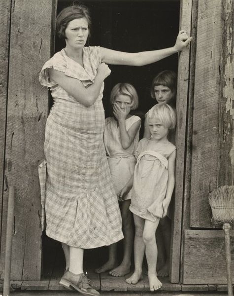 Curator: I find this photograph so compelling, such raw emotion. It’s an untitled work, number three from Milton Rogovin’s Appalachia series, taken sometime between 1962 and 1971. He worked primarily with gelatin-silver prints, didn't he? Editor: Yes, he did. It certainly grabs your attention. I'm struck by the almost oppressive geometry – the vertical lines of the dilapidated porch frame against the girls’ stoic expressions. The high contrast contributes to the serious tone of the image. Curator: Absolutely. Rogovin dedicated his life to documenting marginalized communities, particularly the working class. In this photograph, we see four young girls. They are standing on a porch, their expressions, as you noticed, quite somber. Their social circumstances speak volumes. Editor: Precisely. One must consider the socio-economic climate of Appalachia during that time, struggling with poverty and lack of opportunity. Rogovin’s work, often associated with the Black Arts Movement, served as a form of social commentary. The subjects return your gaze directly, an unspoken challenge to the viewer. Curator: Let’s look closely. The formal composition—the way he arranges these figures, placing them within this tight space, enhances the image's emotional impact. Semiotically, the textures communicate the broader experience of poverty. What do we glean from the materiality of the print itself? The grain, the depth of blacks? Editor: The contrast Rogovin achieves emphasizes both the grittiness and the humanity. Consider how galleries at the time largely ignored art depicting such bleak social realities. His decision to focus on those outside mainstream society highlights a certain power dynamic inherent in art. By focusing on the nuances, Rogovin encouraged empathy within the socio-political contexts of the period. Curator: It’s an image ripe with these kinds of contradictions. What emerges is that it makes you examine your values when facing subjects of societal neglect. Rogovin seems to make a statement about the invisible aspects of reality, making this photograph visually provocative and intellectually complex. Editor: His work challenged societal expectations. Seeing it here today serves as an important reminder of the continued struggle for equality, offering us more than mere historical context—it urges critical self-reflection.