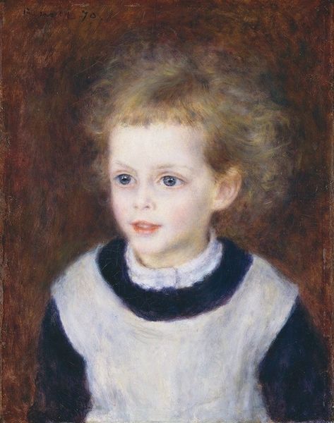 Editor: This is Renoir's "Portrait De Jeune Fille," painted around 1895. The young girl has such a direct, innocent gaze. It’s really striking, and almost haunting. What captures your attention when you look at this work? Curator: Oh, the immediacy of it! Renoir wasn’t interested in perfect representation; he wanted to capture the fleeting moment, the impression of light and feeling. This portrait feels so deeply personal. There’s a certain warmth to it, isn't there? As if you could almost reach out and touch the soft blush on her cheeks. What do you think he’s trying to convey with her expression? Editor: Perhaps her youth and innocence? The gentle colors add to that effect. Curator: Exactly! It's a perfect example of *intimism* in painting. He focused on everyday, personal moments, capturing the essence of beauty in simplicity. And have you noticed how the background almost melts into the figure? It's like she's emerging from a dream. What's fascinating is the level of brushwork--it's loose and undefined. Editor: Now that you mention it, her form isn't sharply outlined at all! I'm curious about his choice not to be more meticulous. Curator: Meticulous wasn’t Renoir’s aim. For him, art was about evoking emotions and capturing sensory experience. This kind of work bridges Impressionism and the road to Modern Art--challenging what painting was capable of, inviting a focus on perception. It's interesting, isn't it, how one little portrait can be so suggestive? Editor: Absolutely. I hadn’t considered the challenge to realism so consciously before. This deeper dive gives the image another meaning that connects to modern ideals about subjective thought. Thank you! Curator: My pleasure. Now, if we look closer at her hair... but we can do that later!