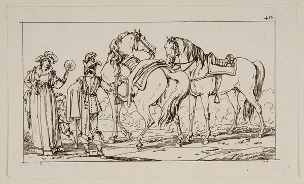 Editor: Here we have Jacques-Francois-Joseph Swebach's "Plate XXV," currently residing at the Harvard Art Museums. It has the feel of a quick sketch. What can you tell me about its social context? Curator: Consider the hunting scene, a popular subject reflecting aristocratic leisure. Swebach likely aimed at a specific audience. How does the style of the print – the lines, the composition – speak to the status of those depicted and viewing it? Editor: It seems idealized, perhaps promoting a certain lifestyle. Curator: Precisely. The print serves as a social mirror, reflecting and reinforcing power structures. Notice, too, how it was distributed, who collected it, and how that influenced its interpretation. It's all a dance of status and imagery. Editor: Fascinating to consider how a simple print could play such a role! Curator: Indeed! And remembering this piece today, it serves as a document of the past.