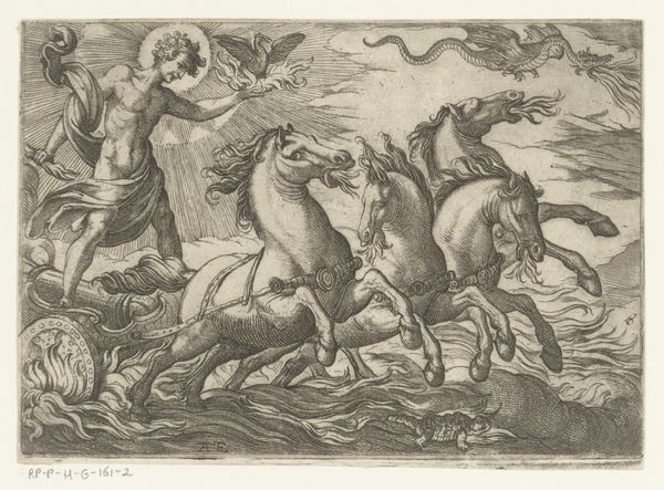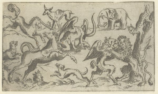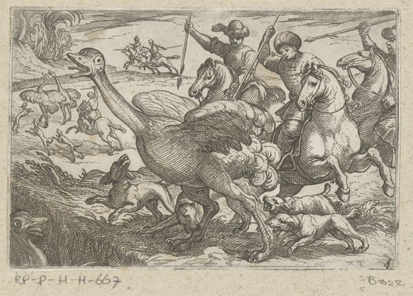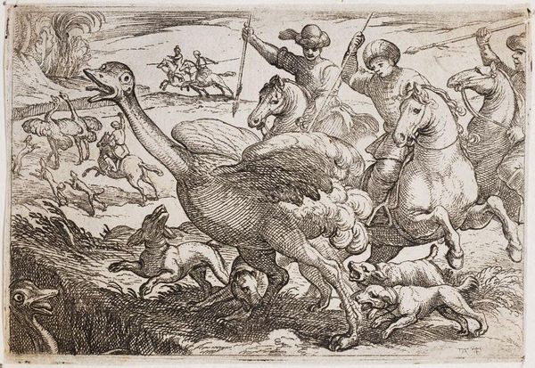Curator: The energy in this piece is immediately striking, isn't it? What do you make of the composition? Editor: Chaotic, bordering on frantic! The dense lines make it hard to distinguish forms initially. You see these men on horseback, a pack of dogs, and…ostriches? It feels a bit like visual overload. Curator: Indeed. We're looking at "Landscape with Ostrich Hunt" by Egbert Jansz, created in 1598. It's an engraving, showcasing a rather unique form of the popular genre of the time. Editor: An engraving, so all those dense lines were etched by hand. It's fascinating to consider the labor involved in creating this scene, replicating this vision into reproducible forms of art. The process becomes incredibly significant here; what materials were they working with, what was the cost? Curator: Absolutely. The medium certainly impacted its accessibility. This would have circulated amongst a particular segment of society. Note, too, how the ostriches, as exotic animals, suggest connections to wider colonial ventures and trade at the time. Editor: The ostrich themselves seem central to the piece. Consider the details etched into their bodies and wings. Is this level of material focus drawing away from some other aspects of this piece's meaning? Curator: One might argue that Jansz' focus isn't only the realistic depiction but rather the symbolic meaning that such hunts held, perhaps connected to status and exotic trade relations of the time, but also perhaps it functions more simply as an exercise in imagination and fantasy of lands and goods abroad. Editor: A fantasy built on labor, though, we can't forget the hand behind this print or the network that spread this print. So it is indeed not just the "fantastic exoticism" of ostriches or hunting, but a social, material construction of this image. Curator: Yes, examining the broader historical context gives this frantic hunt greater resonance than initially meets the eye. It brings up a more profound social picture than a mere hunt, with elements of colonialism and commerce mixing here. Editor: And examining the piece as an engraved object leads one to further understand what an image could *mean* in that time, when it's also understood and sold and held in your own two hands. Thanks for shedding some new light! Curator: And thank you. It’s this constant dialogue, between object, history, and the networks that made it all possible, that keeps this field alive.