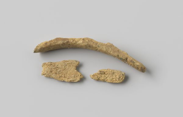 Curator: Here we have “Fragment rib van een rund uit het wrak van de Oost-Indiëvaarder Hollandia,” dating back to before 1748. Editor: Woah, talk about history in your hand, or well, encased in glass! I'm immediately struck by its fragility, like ancient parchment crumbled by time. You can practically smell the sea salt. Curator: Indeed. This artifact, part of the Rijksmuseum collection, is literally a piece of history salvaged from the wreck of the Dutch East India Company ship Hollandia. Editor: I find myself picturing that rib inside the full form of the animal. Did they just eat better on the ship or sacrifice them in case of heavy storm? What was it to them, more than just a piece of dinner. You know, it brings such a human aspect into what can often feel like dry, factual accounts. The wear and spots gives such depth to it, it speaks volumes of its journey. Curator: What fascinates me is its form and texture. It’s an anonymous sculpture formed by accident, by the very sea and the weight of time. It speaks not of classical form but organic processes and a shift from purpose to a new state of being. It exemplifies entropy as artistic medium, a silent scream that links natural science, historical trauma and sculpture together into an idea. Editor: Hauntingly put, isn't it? I feel a story aching to burst out. It's amazing how something so small and seemingly insignificant can evoke such vast emotions and possibilities. Imagine this on a mantelpiece with a spotlight pointing up? Curator: And perhaps that, ultimately, is the power of the relic, not just as document, but as an art object speaking to materiality, memory, and history, all bound together. Editor: Totally. It's a small, understated artwork, that speaks of immense journeys. From life, through commerce and death into a new life within a museum. What a beautiful contradiction.