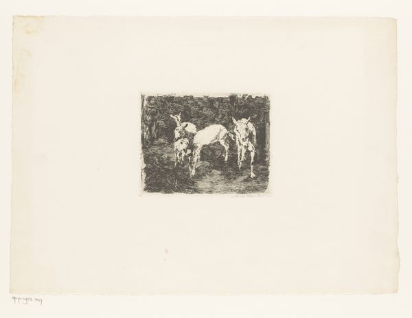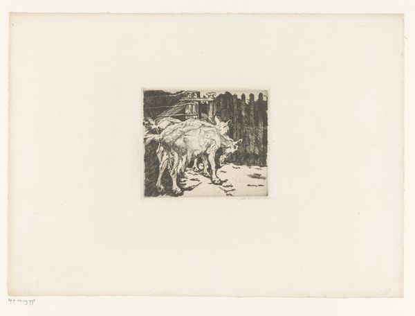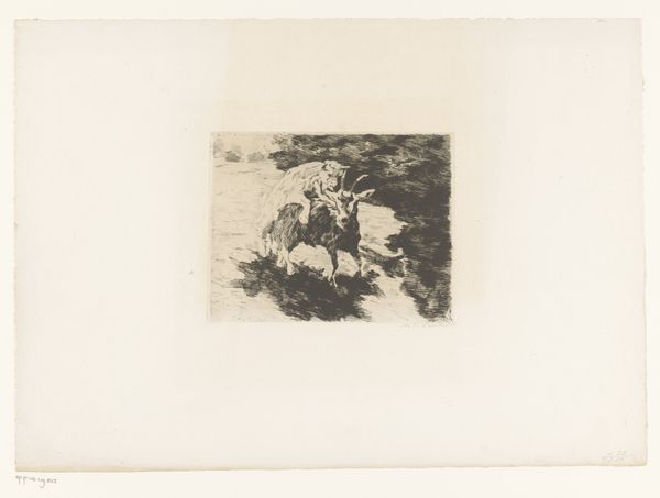 Adolf Eduard Herstein made this etching of ‘Two Goats in a Meadow’ without a known date. Herstein was born in the Netherlands during a time when there was an intensified focus on national identity through art. The image portrays a pastoral scene with two goats grazing. In the background, a figure stands in the field amongst the livestock. Consider that the figure is a shepherd, an archetype with a strong presence in Dutch art as a symbol of rural life and national character. Herstein’s choice to depict the goats in a meadow suggests an interest in capturing the essence of the Dutch landscape and perhaps a longing for a simpler, agrarian past. While seemingly straightforward, the image also reflects complex dynamics of labor and class. Rural life often romanticized in art glosses over the harsh realities faced by agricultural workers. Through this piece, we might ask ourselves questions about the value and the representation of the working class in the Netherlands at the turn of the century. The artwork thus functions as both a reflection of national identity and a commentary on the socio-economic conditions of the time.