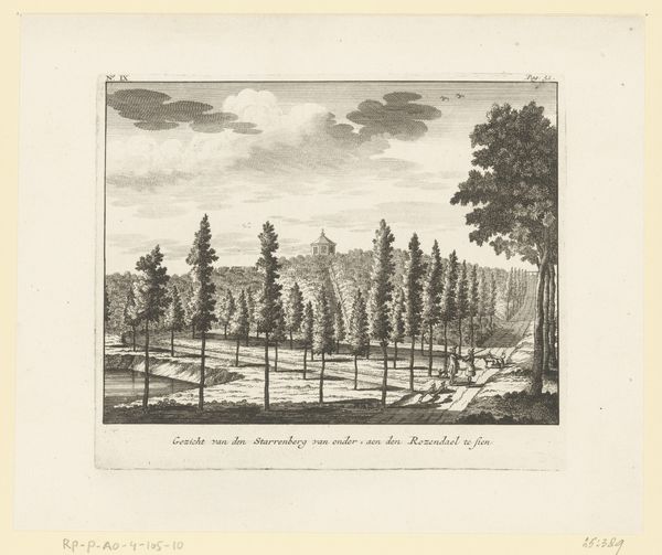 Curator: Alright, let’s talk about this delightful scene. We're looking at "Gezicht op de Maliebaan te Utrecht," or "View of the Maliebaan in Utrecht," rendered in a print sometime between 1755 and 1779. The details are achieved through the technique of engraving, now residing in the Rijksmuseum collection. Editor: Ah, yes. My first impression is this feels meticulously staged. The converging lines draw me in like a forced perspective trick on a theater set. There's a dreamlike quality, softened by delicate watercolors—a rosy escapism, I'd say! Curator: I agree! Notice how the strong lines of the baroque style help structure the idyllic vista. The way the avenue narrows in the distance showcases a real mastery of perspective, creating that sense of depth. And yes, it's all rather idealized; life, but make it Rococo! Editor: Speaking of Rococo, the little figures seem so preoccupied, they hardly register in this constructed paradise. Do you think that detachment speaks to anything specific about the artist or maybe about life during this era? There is some delightful detail to note too... A little splash of pink on a building to the left and again, like an echo, on a building toward the center line, where one carriage travels and where a gathering of people share something in the sunshine! Curator: Hmm, fascinating. The artist places the common citizen into a much larger story of town design, almost unimportant at this scale but adding texture and activity, like punctuation in a longer novel. Their leisurely pace along the Maliebaan offers, to me, a picture of societal values focused on appearances of order, but it's undeniably soothing. Editor: Order maybe, but within this framework I sense that a kind of stillness prevails—as if one moment is being held indefinitely in aspic. Curator: True. In this stillness we gain more opportunity to appreciate its charm. I've enjoyed noticing new facets in a picture I already had great respect for. Editor: Agreed. A perfectly delightful jaunt down a well-ordered street!