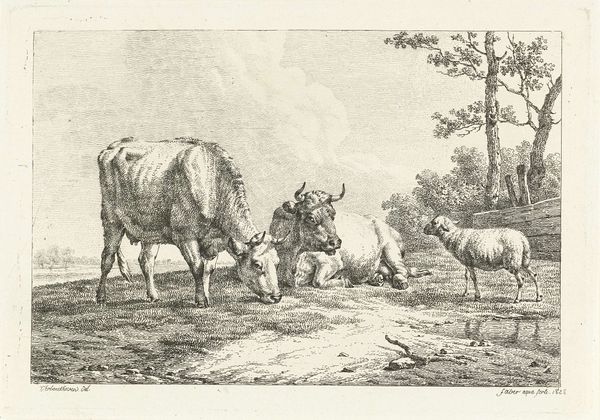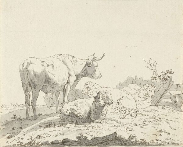 Curator: This is Pieter Gerardus van Os's etching titled "Koe met twee schapen," created sometime between 1791 and 1839. You can currently find it here in the Rijksmuseum's collection. Editor: It's a rather unassuming composition at first glance—a grazing cow looms, its backside towards us, while two sheep rest in the lower left. There’s something very grounding and stilling in the scene’s gentle tonality and straightforward presentation. Curator: I think you've hit upon the central theme. Van Os here references the bucolic tradition and arcadian fantasies but subverts the human-centric approach by depicting animals. In that era, they represented national prosperity and stability. These are symbols of wealth and pastoral virtue. Editor: I agree about subversion, though my analysis differs. The perspective is unusual. Placing the cow’s rear so prominently, nearly center, isn’t exactly classically appealing, is it? However, this disruptive choice is technically compelling. It forces our eye to move, seeking the forms within and around it. It highlights a tension between a realistic rendering and a consciously artistic arrangement. Curator: Interesting point. The almost nonchalant placement of the animals evokes, perhaps unintentionally, the cycle of life and the presence of animals which remain relatively unchanged in a modernising world. The scale of the cow, though imposing formally, is also reassuring. The eternal cycle of sustenance, a comfort in tumultuous times, do you agree? Editor: To some extent, yes. Van Os’ etching possesses a textural richness; notice how the lines suggesting shadow create an impression of solidity in the cow’s form versus the softer treatment of the sheep. It is an early Realist depiction of the animal which makes this piece very enduring. Curator: I find this exploration shows how art gives form to the shared symbolic world that we draw from and contribute to through generations. Editor: Yes, I see what you mean and in the same way it challenges the very premises by which we discern art itself through the masterful handling of line, shade, and subject.