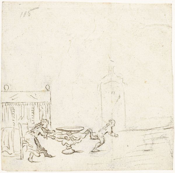 Editor: Here we have "Komposition: Udsigt gennem en port..." from the 1840s, made with ink by Dankvart Dreyer. There's this guard, seemingly bored, leaning by a gate, while everyday life unfolds behind him. It's all very sepia-toned and sketch-like. How do you see this artwork functioning within the scope of Romanticism? Curator: It's fascinating how Dreyer uses this seemingly simple city view to engage with deeper questions about societal power structures, and the role of the individual within them. Think about the figure of the guard. He is positioned at the intersection of public and private space, seemingly controlling access, yet also appearing marginalized – almost melancholic – in his posture. What does that say about authority during the 1840s? Editor: So, not just a guy guarding a gate, but maybe representing anxieties about power and individual agency? Curator: Precisely! Consider also that the cityscape in the background seems to recall the Odense Cathedral; by doing so Dreyer interjects questions related to national and religious identity. How do those forms, viewed through the architecture of power in the foreground, then complicate our reading of Romanticism beyond just landscapes and emotions? Editor: I didn’t catch the religious angle. The way you frame it, the drawing's really not just about a pretty view, it becomes a social commentary. Curator: Indeed! Dreyer prompts us to think about how architecture and figures create narrative. His choices emphasize a sense of spatial and social separation, inviting viewers to question the prevailing norms and dynamics of 19th-century Danish society. Editor: That completely changes my view of what’s happening. It’s amazing to think about how a simple ink drawing can contain so many layers of socio-political meanings. Curator: Exactly! Art is never truly "simple", it's often a reflection of larger conversations that echo far beyond the canvas or page.