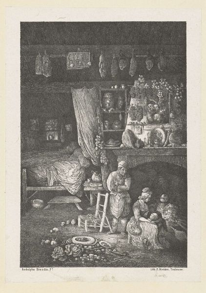 Rodolphe Bresdin made this print, "Flemish Interior," using a metal plate, likely copper. He would have painstakingly etched or engraved his design into its surface. The result is a dense, intricate network of lines that create an atmosphere of enveloping domesticity. Look closely, and you can almost feel the weight of labor in this humble home. The textures of the thatched roof, the rough-hewn furniture, and the clothing of the figures are all rendered with a meticulous attention to detail, evidencing the amount of work involved in its production. Bresdin's technique also has social significance. Printmaking allowed for the wider distribution of images, making art accessible to a broader audience. This piece is not about the grand or the luxurious, but rather the everyday lives of ordinary people. This elevation of the quotidian breaks down the traditional hierarchy between high art and the realities of labor. By emphasizing the materials, processes, and social context of artistic creation, we can gain a richer understanding of the artwork's meaning and its place in the world.