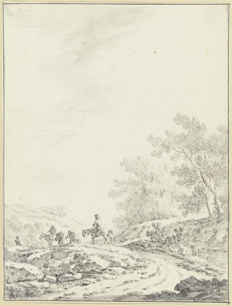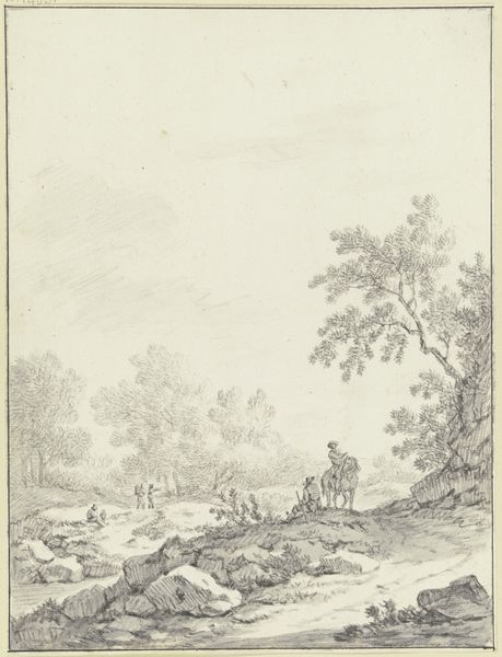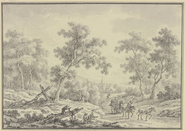 Johann Christoph Dietzsch made this drawing of an undulating wooded landscape at an unknown date. The drawing encapsulates rural life, capturing a moment of rest for land workers alongside a hay wagon and animals. It reflects the social hierarchy of the time, with the presence of a horseman suggesting a figure of higher social standing amidst the resting laborers. Made in 18th century Germany, the drawing exists within a cultural context defined by agrarian economies and nascent class divisions, elements influencing its creation. Analyzing such images requires an understanding of social structures, such as land ownership, labor practices, and the role of rural life in German society. Through historical research, we can consider the meaning of art as contingent on its social and institutional context.