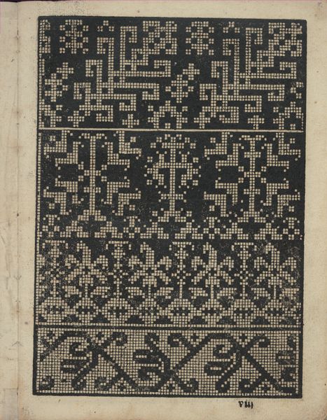 Editor: Here we have page 12 from *Libbretto nouellamete composto per maestro Domenico da Sera...lauorare di ogni sorte di punti,* created in 1532 by Domenico da Sera. It's a print on toned paper, and it looks like a detailed pattern. What’s interesting to me is how abstract and modern it feels despite being so old. What do you make of this Domenico da Sera design? Curator: You know, it's amazing how relevant these historical patterns still are. The Renaissance was all about rediscovering classical ideals, and this, to me, seems like a fantastic marriage of ancient geometric principles and a very modern sense of artistry. It’s a blueprint! Imagine women (mostly) of the era, poring over these pages to create incredibly intricate needlework. This wasn’t just decoration; it was a deeply embedded cultural language. Can you see how each shape and line could become a stitch, each page a community project? Editor: I can! I didn’t really think about it being a pattern for needlepoint. It seems more abstract when you consider it on the page rather than the finished textile. Were there any particular symbolic meanings woven into these patterns, or were they primarily decorative? Curator: Oh, there are always potential symbolisms, but I think the emphasis here is really on the artistry of construction. These patterns empowered women to add artistry and individual expression to clothes and tapestries at a time when their autonomy was scarce. But perhaps the simple act of applying geometric design, the very architecture of the cosmos, to domestic craft held a certain power. Don't you think? Editor: Absolutely, the idea of transforming everyday life into art… that’s powerful. It's definitely a new way to look at Renaissance art for me! Curator: For me, seeing this gives me a beautiful image, like bees diligently working on their honeycomb. Every precise movement of the needle results in a beautiful, enduring pattern. A quiet revolution of thread.
