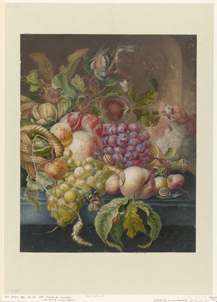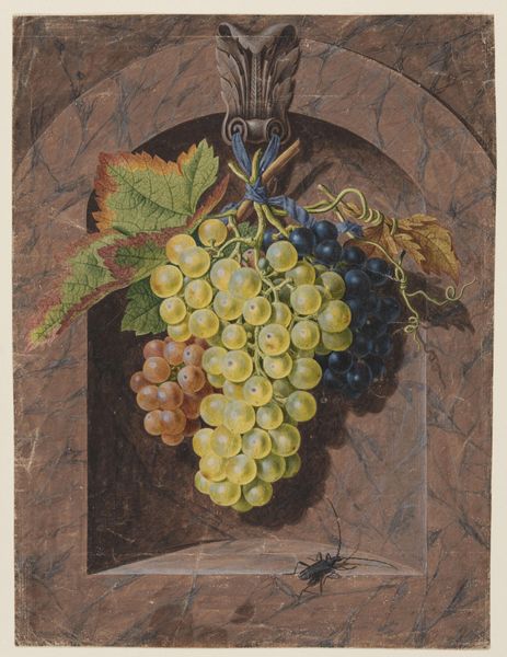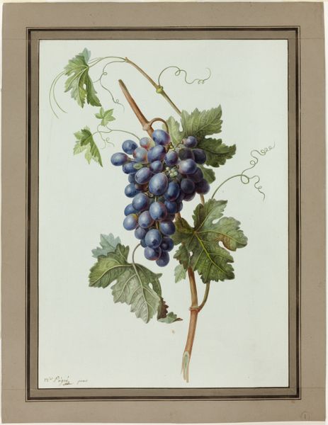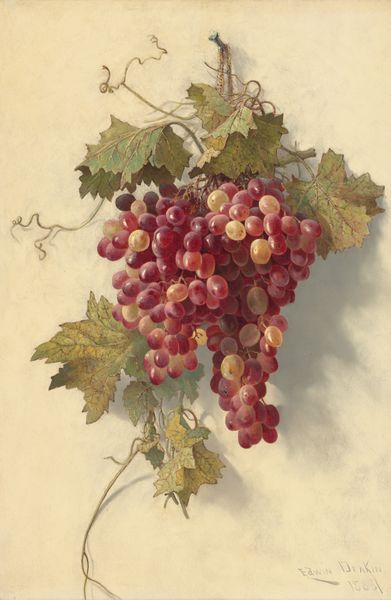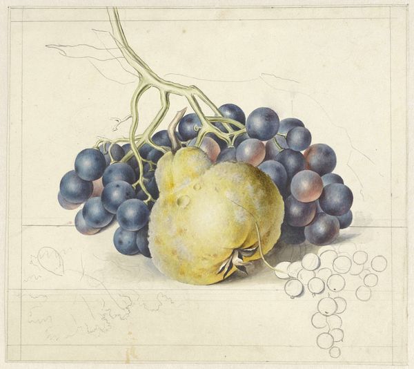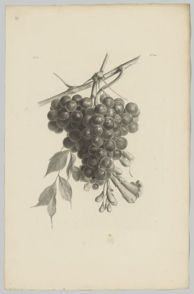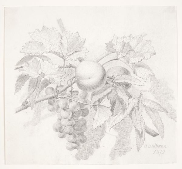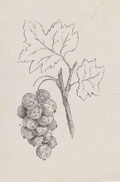 Editor: We’re looking at “Zeichnung zur Fibel_Traube,” a pen and ink drawing of grapes by Hans Thoma from around 1905, housed in the Städel Museum. There’s something almost stark about it, just these very clearly delineated shapes of the grapes and leaves. What's your take on this work? Curator: This image speaks to the rise of art nouveau as a commercial force. While ostensibly a botanical study, its clean lines and graphic nature point to its probable origin as a design for mass reproduction. Consider the “Fibel” – presumably a primer, perhaps a children’s book? Editor: Oh, I see! So, this drawing was intended to be educational and, on a wider scale, appeal to the masses? Curator: Precisely! Thoma, positioned within a shifting art market, catered to the increasing demand for accessible art. It demonstrates the influence of simplified forms and naturalistic motifs prevalent in advertising and decorative arts of the era, bringing art into everyday life. How does that revised perspective affect your understanding? Editor: It definitely shifts it. Initially, I saw it as a straightforward still life. Now, knowing its potential function as part of a learning tool really opens it up. It becomes less about pure aesthetics and more about accessibility and distribution of knowledge and artistic style. Curator: The role of institutions like the Städel in preserving such images also becomes significant. Are they valuing it as "high art" or as a document of cultural and artistic dissemination? These are questions worth considering. Editor: That's a great point. Thinking about the institutional context definitely changes the way you view the piece itself. Curator: Indeed. This seemingly simple drawing reveals a complex intersection of art, education, and commerce within a specific historical and social landscape. It challenges our notions of high versus low art.