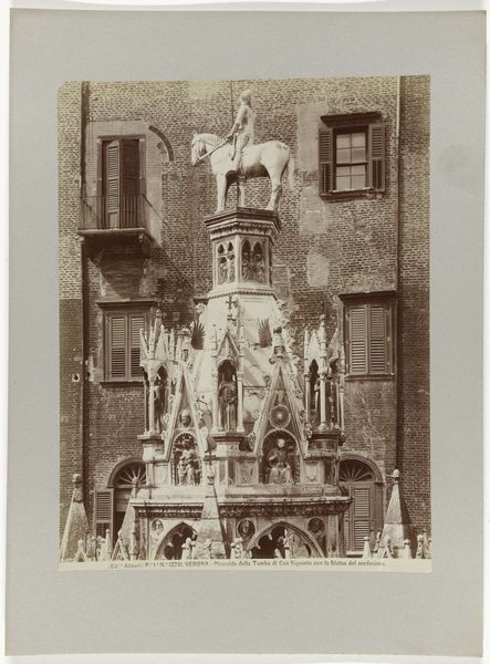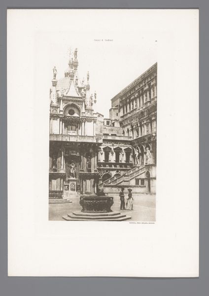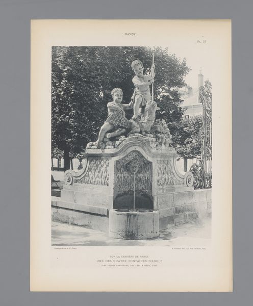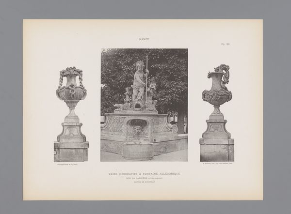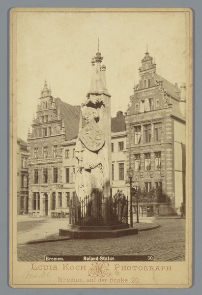 Editor: We’re looking at "Tugendbrunnen in Neurenberg," a photograph from 1895 by Ferdinand Schmidt, currently housed at the Rijksmuseum. It's a cityscape, showing the 'Virtues Fountain.' It strikes me as quite formal and imposing; what exactly am I seeing here? Curator: It's more than just an image of a fountain; it's a dialogue between sculpture, architecture, and urban life, captured through the relatively new medium of photography at that time. Schmidt plays with depth, light, and shadow, doesn't he? He gives you a feeling that the photograph has a 3-d form like a sculpture. Almost like Schmidt is sculpting with light, eh? What stands out to you, Emma, compositionally? Editor: Well, Lady Justice, with her scales, is central, obviously, but my eye is drawn to the contrast between the smooth, classical figures and the rougher textures of the surrounding buildings. Curator: Exactly! It’s about contrasting ideals with everyday life. Do you feel the Neo-Classical vibe? The way that it’s designed and placed reminds you of past ideas? This placement suggests more than just decoration but how Neurenberg society saw law at this time. This contrast emphasizes how cities in the period aimed to link classic thought into the urban environment. Editor: It does. I see the Neo-classicism. I hadn't quite picked up on the link between sculpture and place. Thinking of architecture as sculpture too. Thanks. Curator: That interdisciplinary link is quite beautiful and the soul of city design at the time!