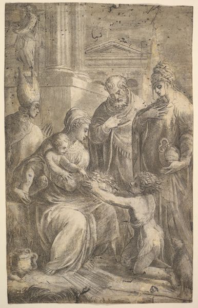 Curator: What strikes me first is the ethereal, almost dreamlike quality of this print. It’s as if we’re peering into a half-remembered scene. Editor: Yes, there is an air of mystery about this image; you would almost think it was a photograph of something caught on camera through a misty day. So, what is it? Curator: This etching is titled "Holy Family with Saints", and was created by Andrea Schiavone, sometime between 1500 and 1563. Currently, it is housed right here in the Metropolitan Museum of Art. Editor: Schiavone, huh? Makes me think of words like "chiaroscuro" and "sfumato"—not in the same way, obviously, since it’s not paint, but that shadowy depth and softened, hazy atmosphere are so prominent here. Tell me, what’s happening here, culturally speaking? Curator: Schiavone was working during the Italian Renaissance, and this print clearly draws on that period’s fascination with both classical themes and Christian iconography. Prints in this period functioned much as photography would later—to make the artwork and the idea accessible, available beyond the elite who commissioned grand paintings. Look closely, and you'll see the distinct influence of Parmigianino in the figures and the setting he chooses. Editor: There’s this immediate tension— between intimacy, with the holy family grouped together in a cluster and with the offering of flowers. It contrasts to a type of grandiose stage. Also, who is this dark form emerging behind that huge column in the backdrop, right? Who needs a stage director to conjure this up for me in theatre? Curator: Exactly! And that architectural backdrop itself is making a statement. Look at how Schiavone uses linear perspective to draw the viewer's eye. Editor: It's beautiful and so theatrical, though there's something also unsettling in the way that everything is captured. Like looking at a collective secret being staged for the ages! And how interesting it feels at the same time that the Holy family is almost collapsing! Curator: The print medium really allowed for such broad circulation. Schiavone could influence artists across a wide geographical area. And by the way, note the child; the figures convey tenderness toward the newborn, humanizing them, allowing wider empathy with their struggles as well. Editor: Seeing it laid bare through the printmaking almost allows to expose more. These figures aren't simply iconic. It gets into all the tiny fractures in the idealized family unit to me, exposing humanness to such a story—warts and all. Curator: An absolutely crucial point about printmaking is how it democratized the image! Schiavone made possible broad cultural discussions about family and belief. Editor: This piece really resonates. It challenges as much as it comforts, it’s like a Renaissance whisper echoing even now.