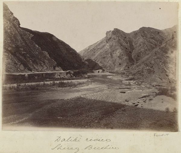 Editor: So, this is Antoine Sevruguin’s gelatin silver print, "Dorp Pachinar aan een rivier in Perzië", circa 1880 to 1895. The muted tones give it an almost dreamlike quality. What strikes you about this photograph? Curator: The choice of gelatin silver is interesting. It was becoming commercially dominant at this time, democratizing photography, making it cheaper, quicker. Consider how Sevruguin documented Persian life; he wasn't just capturing images. He was producing a commodity, a visual product for consumption, mainly by Europeans seeking an exoticized Orient. Editor: So, the medium itself points to a specific intention and audience? Curator: Exactly. Look at the composition; the careful arrangement of the river, the village. It evokes a sense of authenticity but consider who is framing this narrative and for what market. What labour was involved? Editor: I see what you mean. It's not just about aesthetics; it’s about the economy of image-making. So the photograph operates almost like a…souvenir? Curator: Precisely. This wasn't simply an objective record. Sevruguin ran a commercial studio. The prints were sold, traded, circulated within networks fueled by colonial interests. These "landscapes" fed a specific appetite for the East. Think of the darkroom as a small factory, producing visions on demand. Editor: Wow, I hadn't thought of it that way before. It’s not just a beautiful scene; it's part of a much bigger social and economic picture. Curator: And the act of viewing then becomes equally complex, charged with historical and political weight. Understanding the materiality helps unlock that complexity. Editor: Right, it shifts the focus from "what" is depicted to "how" and "why" it was depicted that way, and for whom. Thanks, I’ll definitely keep that in mind!