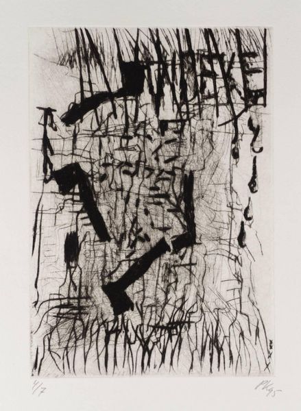 Editor: So, here we have Alan Davie's print, "For the Hens," currently residing at the Tate. It's a striking black and white image, almost primal in its markings. The composition feels both chaotic and oddly balanced. How do you interpret this work, especially given its title? Curator: It's as if Davie's channeling some ancient ritual, isn't it? I find myself wondering if he's inviting us into a conversation between chance and intention, with the hens as silent observers, or perhaps, active participants? The stark contrasts highlight the raw energy, the unpredictable dance of life itself. Does the title guide your interpretation, or does the imagery take you elsewhere? Editor: It definitely makes me think of a farmyard, but in a very abstract way. Like a child's memory of one. Curator: Exactly! Davie often aimed to tap into that childlike spontaneity, that unfiltered expression. And, isn't that what makes art so endlessly fascinating? Editor: Absolutely, I’ll never look at a farmyard the same way!