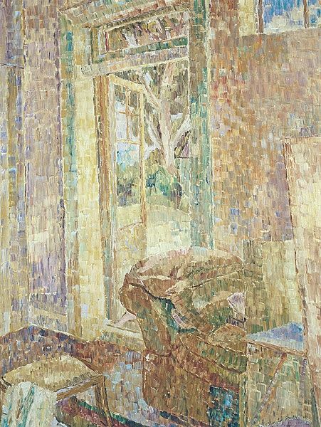 Curator: The painting before us is titled "Interior, Pierrefroide," by Madge Oliver. Editor: Oh, my first impression is that it’s a symphony of blues and greens, a rather wistful, melancholic tune. Curator: Indeed. Oliver employs a thick impasto, creating a palpable sense of texture, a materiality that draws you in. Editor: The brushstrokes are almost frantic, lending a certain energy to the still life, challenging the quiet domesticity of the scene. Curator: You feel that too? I see it as Oliver’s attempt to capture the essence of a place, that intangible feeling of being inside, looking out. Editor: I do. The visible brushwork combined with the domestic scene invite viewers to decode the personal language of interiority. A moment captured. Curator: A beautiful testament to the power of paint, and the stories interiors can tell. Editor: Absolutely—the painting seems to whisper secrets of the past.