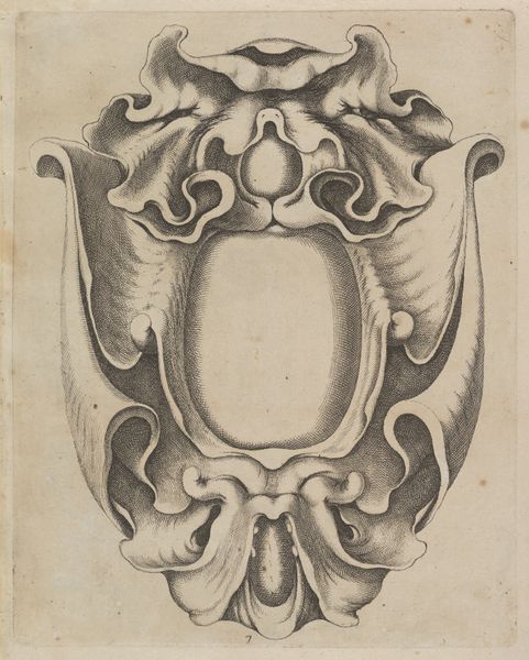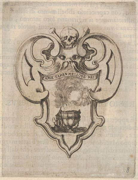 Curator: Let’s turn our attention to this etching by Stefano della Bella, dating back to the mid-17th century. The piece is titled "A cartouche with a violin coming out of its case, a skull with a helmet with feathers at top, from 'Eight Emblems for the Funeral of Francesco de Medici.'" Quite a mouthful, I know. Editor: Woah. My first thought? Melancholy hits a high note! I mean, a violin emerging from a case juxtaposed with a skull—it’s like a serenade to mortality. Stark, ornate, baroque…it’s all whispering "remember you must die." Curator: Precisely. The imagery speaks volumes, doesn't it? The cartouche itself is lavish, but the inclusion of the skull suggests a 'vanitas' theme, a reflection on the transience of life. The violin, poised to play, perhaps symbolizes the fleeting beauty and brevity of earthly pleasures. Editor: Right? You almost hear a ghostly melody about to fade. And that feathered helmet on the skull—it’s almost theatrical, like death is dressed up for a grand performance. Is the whole thing about reminding Prince Francesco what he’s leaving behind, all the finery of court? Curator: Perhaps. It was designed as one of a series of emblems for his funeral, and so the work almost certainly comments on his place as a member of the Medici. This print acts as a structured symbolic exercise rather than merely a somber portrayal of mortality. Look how Bella organizes symbolic images within its very formal and decorative framework to convey the significance of this death to Medici political power. Editor: The text swirling above the violin, can’t quite make it out… it almost sings a praise to what has passed, “Cantet tibi Gloria”—“Glory to thee.” What are we to learn about glory and the things we leave behind, beyond artful lament? Curator: A complex idea, but certainly this work prompts introspection, doesn't it? Bella masterfully interweaves artistic flair with reminders of our mortality. Editor: It's Baroque memento mori with a dash of operatic flair. A somber tune to which time marches to! I think this piece teaches that facing death isn't just morbid; it is also an exercise of accepting all facets of the life that was, both triumphs and fleeting pleasures.
