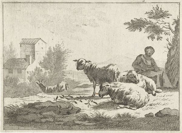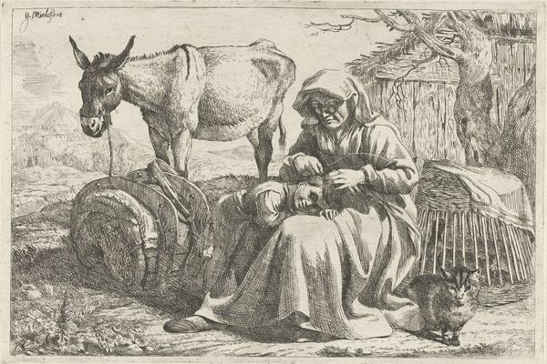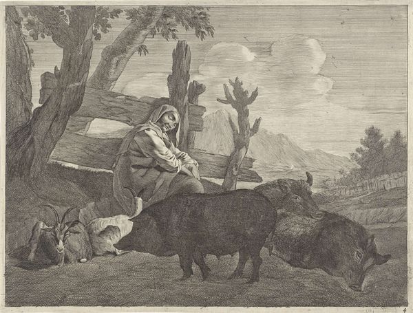 Curator: Before us hangs Charles Jacque's "Little Milkmaids," an etching from 1864 currently residing here at the Metropolitan Museum of Art. It offers an intriguing window into rural life, wouldn’t you agree? Editor: It absolutely does! There's something quite melancholy about it, don't you think? A sort of pensive stillness. The soft grays and whites enhance that mood—almost like a faded memory. It's pastoral, but not idyllic in that idealized way. Curator: Precisely. The "Little Milkmaids" can be examined through the lens of genre painting, but also intersects with the emerging Realist movement. It's important to recognize that Jacque, while sentimental, sought to portray the labor of rural women with a degree of unvarnished authenticity during a time when rural labor was heavily romanticized. Editor: Yes, the stoicism is so present. Look at the girl standing—the folds of her clothing, her gaze fixed downwards. It's not romantic—it’s simply life as it is, imbued with a subtle dignity. What is she thinking about? Is she tired? And then, the other young girl. She seems totally absorbed by something happening on the ground. Curator: It's the contrast between the standing girl and the girl on the ground that is fascinating. The one is burdened by expectations of womanhood while the other remains for a moment yet carefree, though soon to be similarly situated in her duties and social limitations. The scene speaks to a particular class status, visible even in their clothing, don’t you see? Editor: Oh, absolutely. But to me it speaks also of timeless bonds of sisterhood, almost, and an apprenticeship of the mundane. There’s a tenderness there too—they are both rooted in nature and each other’s company, so it also radiates peace. Curator: This makes the symbolism quite dense with interpretive layers. We see a representation of labor, an illustration of a life largely unchanged for centuries, and the dawning recognition of gendered and class expectations. Editor: This piece invites the quiet observer to look into their world, into their dreams and concerns, no? For me it triggers my nostalgia, like I am one of those grazing cows… lost in this gentle, beautiful past. Curator: A world and moment defined by both beauty and its limitations. It is pieces such as this that help us understand that past as deeply intersectional. Editor: Beautifully said.