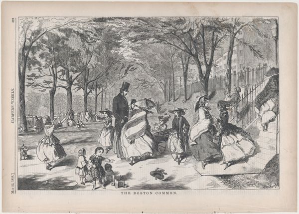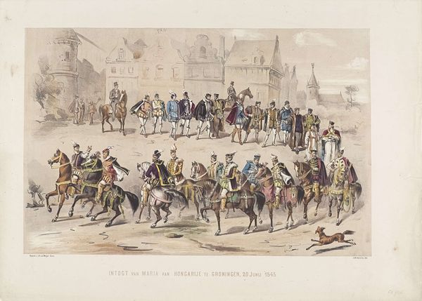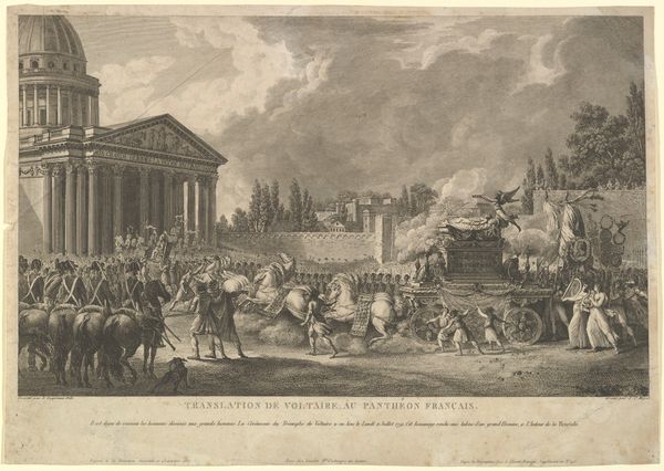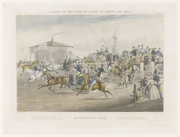 Editor: Here we have “View of a Street and Wellington Arch at Hyde Park Corner," created in 1838, by John Harris, using watercolor. It captures such a vibrant, bustling street scene; I'm struck by how many people are out and about. What can you tell me about the public's relationship with Hyde Park at this time? Curator: This print provides a window into the socio-political landscape of 19th-century London. The Wellington Arch, still relatively new, symbolized British military triumphs, yet its placement also reveals the complexities of urban development. Consider how the image celebrates aristocratic leisure, showcasing fashionable figures prominently. It hints at an uneven distribution of space and privilege. Do you notice anything about who is shown versus who is likely absent from the scene? Editor: Well, you don't see many working-class individuals represented here. Everyone seems very well-dressed and appears to be a member of the upper classes, which really contextualizes the whole idea of leisure. Curator: Exactly. Harris likely aimed to cater to a specific audience with refined taste. The print subtly reinforces prevailing social hierarchies. Think about the museums of the era; who did they serve, and whose stories were deemed worthy of representation? This image, similarly, is a product of its time, reflecting particular values and power structures. Editor: That makes me consider how art served specific audiences. Thanks for shedding light on the socio-political dynamics at play. Curator: My pleasure. Examining art through the lens of history illuminates its cultural significance and social context. It reveals whose stories were being told and whose were being excluded from these narratives.