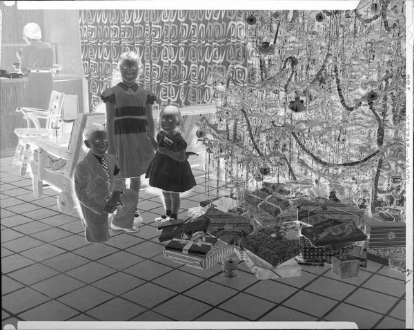 Editor: This is an untitled photograph by John Deusing of Santa talking to a little girl. It's quite small, only about 4x5 inches, and the grayscale gives it a nostalgic mood. What strikes you most about this image? Curator: The seeming innocence is striking, but I question the power dynamics at play. Santa, traditionally a symbol of generosity, here occupies a position of authority. Consider the societal construction of childhood innocence versus the commercial exploitation inherent in Santa's role. How does this image reinforce or challenge those power structures? Editor: I hadn’t thought about it that way. It's interesting to consider Santa not just as a gift-giver, but as a figure of authority within a capitalist system. Curator: Precisely. And by capturing this interaction, Deusing prompts us to question the larger cultural narratives we often take for granted. We must consider whose interests are served by perpetuating this image. Editor: I see. It is much more complex than I first thought. Thank you!