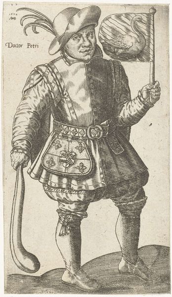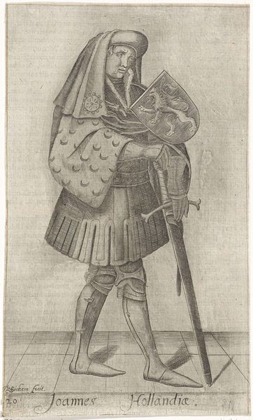 Editor: Here we have Adriaen Matham's "Portret van Karel de Stoute, hertog van Bourgondië," an engraving on metal from 1620. It's fascinating how Matham uses such fine lines to render the Duke's armor and fur-trimmed cloak. How would you interpret this piece from a formalist perspective? Curator: The beauty here, as you’ve rightly noticed, lies in the meticulousness of the line work. Observe how the varying density of hatched lines creates areas of light and shadow, giving volume to the figure and defining the textures. Notice the formal arrangement of elements—the verticality of the figure countered by the horizontal line of the sword, and how the shield functions as a focal point, echoing the intricate designs found throughout the armor. What do these visual contrasts and repetitions suggest to you about the artist's intent? Editor: It's like the details aren't just details. The way the artist contrasts light and dark must add an essential weight to the subject! Curator: Precisely! Matham isn’t simply reproducing an image. He's composing a study of textures, of light, and form. It showcases how an engraver can transform a historical figure into a purely visual experience. Consider the relationship between the detailed rendering of Charles’s attire and the relatively bare background; a decision, I suspect, rooted in formal concerns rather than narrative ones. What meaning do you derive from that? Editor: It isolates the figure, so our eye keeps bouncing around his cloak, his shield, the hat. This directs the viewers to his significance as a nobleman, a heroic icon with detailed features defining who he is? Curator: Exactly! And even deeper than the texture and detail of what comprises him is the negative space surrounding, enhancing his monumental silhouette! That understanding transcends the portrait itself. Editor: It definitely gives me a different view to focus on visual features. I feel a newfound respect for the language and how the work speaks volumes of the era through just these small strokes and visual cues.