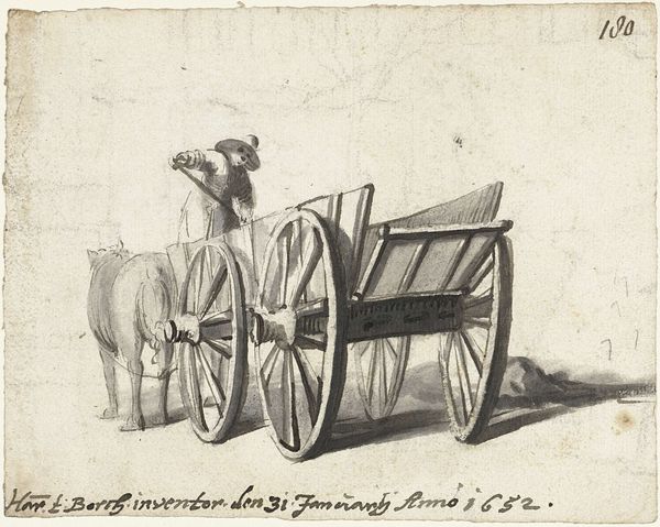 Curator: Today, we're looking at "A Tatar Farm Wagon," a woodcut or engraving made around 1579 by Melchior Lorck. The print currently resides in the Statens Museum for Kunst, in Copenhagen. What are your initial thoughts? Editor: It's striking, in its focus and detail. A very solid, working thing – the wagon, the way the wood is cut, it feels very grounded. I'm drawn to the texture achieved solely through line work. Curator: Lorck was quite a figure, working as an artist and diplomat across Europe. His depictions of Ottoman life and customs provided Europeans with invaluable insight into a world they barely knew. Editor: Right, it makes you wonder about the practical craftsmanship involved. Where was this wagon made, what kinds of wood, how were the different parts connected? Were they standard designs or specialized for different tasks and regions? It is an artifact born from the physical landscape and the necessities of labor. Curator: That’s a great point. Understanding that social function enriches our understanding. Think about how this wagon was central to Tatar agriculture and trade—facilitating not only commerce, but also movement and cultural exchange. It connects directly to historical trade routes. Editor: And Lorck choosing this subject…what did it signify in a time of shifting power dynamics and cultural exchange? To elevate a simple working wagon—it seems charged, not just as documentation, but commentary. What did people back then make of a foreign cart represented this meticulously? Curator: Perhaps it speaks to a growing European curiosity about the East, but seen through the lens of everyday life rather than exoticized fantasies. Or the way imagery started to take the central place of the thing in a European mind. Editor: So, this print not only provides us an early example of detailed ethnographic studies, it also points to a fundamental relationship between raw materials and social development. Food, materials, and this labor, conveyed by art—an incredible connection. Curator: Precisely, seeing the intersections of art, culture, and utility allows us to engage meaningfully with history. It’s a starkly mundane item depicted to reveal a wider world to its European audience. Editor: The more we delve into it, the more the artwork embodies its reality: an exploration and representation that brings together craftsmanship, use, and social reality of past life.