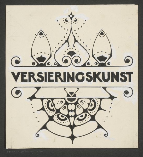 Editor: This drawing, "Ontwerp voor de portefeuille van: Jan Veth, Jozef Israëls en zijn kunst", which translates to 'Design for the portfolio of Jan Veth, Jozef Israels and his art,' dates back to 1904 and is by Reinier Willem Petrus de Vries. It seems to be an ink drawing on paper, exploring typography within a decorative, Art Nouveau frame. I’m really drawn to its understated elegance. What catches your eye about its composition? Curator: The restrained palette of browns immediately strikes me. Note how the artist employed ink not for shading or modeling, but to define forms and articulate a surface pattern. The lines create a symmetrical enclosure around the text, reinforcing the two distinct sections. The interplay of geometric forms, along with the curvilinear flourishes typical of Art Nouveau, work harmoniously to control the design’s movement. Do you see how these elements combine? Editor: Yes, the symmetry definitely provides structure. But it is not exactly perfect symmetry; there are asymmetrical subtleties that bring nuance. The Art Nouveau details soften it, which keeps it from feeling too rigid. Do you read into the artist’s choices of font and framing device? Curator: Typography here goes beyond legibility, it also sets the aesthetic tone. Look at the customized letterforms within that asymmetrical-symmetrical framework, reflecting not just information but mood. Each element appears deliberately weighted and placed. How do you think that shapes the viewer’s reception of Jozef Israëls? Editor: That's interesting to consider. Seeing the typography and Art Nouveau influences in this context makes me appreciate the artist's intentions and process even more. Thanks, that really helps! Curator: Indeed, this exploration proves that the success of art lies not only in the visual details, but in how we interpret its compositional language.