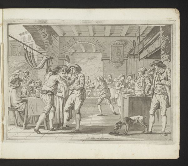 Curator: This engraving from 1659 by Bartolomeo Fenice depicts Francesco I d'Este instructing that alms be given to the poor. It is part of a larger series titled 'L'Idea di un Principe ed Eroe Cristiano in Francesco I d'Este'. Editor: The crisp lines of the engraving give it a decidedly ordered and clean feel. The composition directs the eye to the Duke seated at his table, even though the setting seems relatively humble, almost staged. Curator: I see the setting as deliberate. It presents the Duke, Francesco I d'Este, as not only powerful, but also divinely inspired in his earthly rule, reinforcing the concepts of piety and princely virtue within the visual rhetoric of the period. Note how the poor huddle by the door as supplicants. Editor: Yes, the huddle contrasts with the figure of the Duke, in his crisp angles, but the architecture of the room is almost more chaotic, like a backdrop hastily thrown up behind the Duke to serve some symbolic purpose. The linear perspective seems... almost intentionally off-kilter. Curator: Perhaps that visual unease reflects the precarious position of the poor and their dependence on the Duke’s actions. We have to recall the social structures of the time; famine, poverty, and disease were ever-present realities for most, against the opulence enjoyed by the ruling elite. Editor: The eye is drawn to the contrasting scenes framed on the wall: on one side, we see men sparring, a struggle for power, whilst, opposite, is a mythological hunt, which makes me reflect upon the subjectivities in history paintings. Curator: These images become symbols within the larger image, and hint at a visual program reinforcing d'Este's enlightened leadership. These artworks reference both the intellectual and physical demands of good governance. The act of distributing alms becomes not just an act of charity but a display of the ruler’s capacity for reasoned compassion, his judicious wisdom. Editor: Even the lines dividing wall from wall are dynamic. This is an artwork that deserves deep observation. I see now, perhaps this backdrop serves a function beyond surface-level illustration. Curator: Exactly! By carefully considering the engraving’s formal elements in concert with the historical moment, we unveil richer narratives.