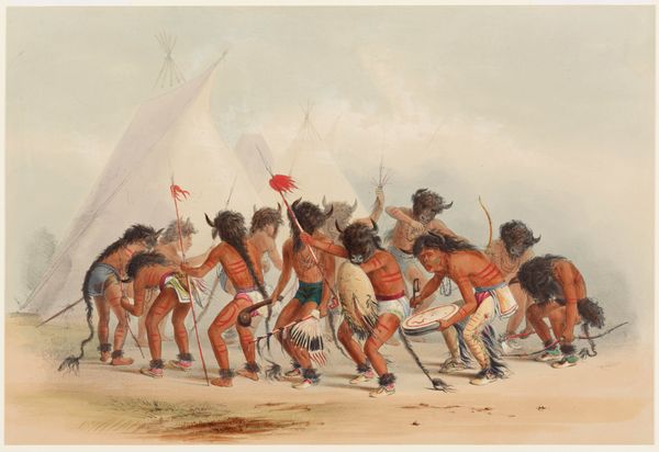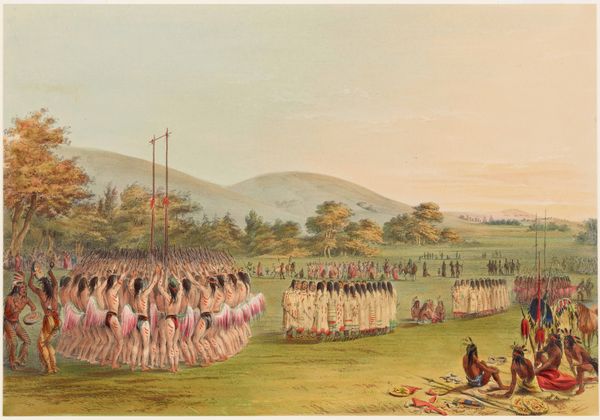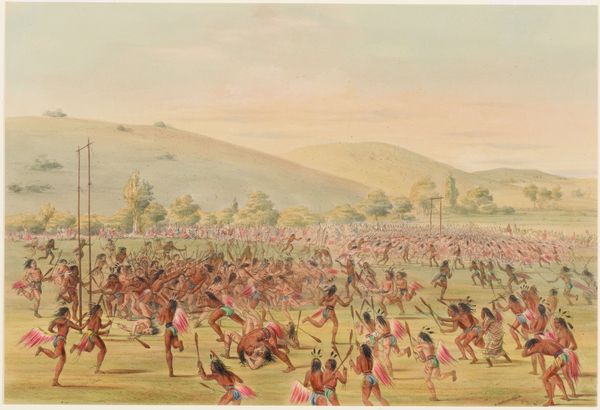 Curator: What strikes me most immediately is its seemingly detached point of view on Native life. Editor: This is “Ball-Play Dance,” an 1835 oil painting by George Catlin. The long view reminds me of landscape painting, like the Hudson River School. It shows a game being played on a large field. What do you see in this piece? Curator: Catlin, like many artists of his time, presents a romanticized view of Indigenous people. What looks like simple documentation is actually a performance of power. How do you see that manifested in the composition? Editor: Well, the groups are separated in distinct zones receding into the background…Almost like different acts of a play unfolding. Is this an issue of representation then? Curator: Precisely. We must ask ourselves, who is Catlin representing and for whom? His paintings, while seemingly ethnographic, reinforced existing stereotypes and facilitated the narrative of Manifest Destiny. Are the people active agents in the painting or subjects for a Western audience? Editor: So, even a painting that seems to simply depict a scene can actually be a political statement, reinforcing existing power structures and influencing perceptions of marginalized groups. It challenges me to be more aware. Curator: Exactly. It encourages us to examine our own assumptions about representation and to consider whose stories are being told and how. This has been a worthwhile discussion.