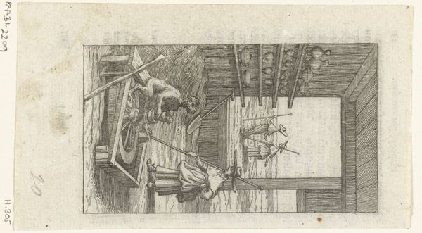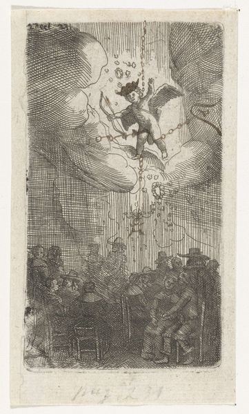 Curator: Immediately, what strikes me is the activity in this image; there's so much dynamism. It's bustling despite its monochrome palette. Editor: Here we have a detailed engraving, likely an etching, rendered in ink by Boëtius Adamsz. Bolswert, titled "Duyfken en Willemynken bij kerktoren met vogels." Created sometime between 1590 and 1627, it's currently housed in the Rijksmuseum. Bolswert, well-known for his printmaking, captured scenes reflecting everyday life alongside allegorical subjects, reflecting the rising popularity of genre painting during this period. Curator: It certainly portrays an almost chaotic yet strangely idyllic landscape. The textures he achieves through line variation is interesting, especially observing the cliff face on the left, the density of hatching really suggesting the roughness and solid mass. Editor: Absolutely. Note how he meticulously captured both the grounded reality—farmers and livestock plodding along—with soaring, near-abstract flock of birds circling around that somewhat austere church steeple. Considering the sociopolitical context of the Dutch Golden Age, with its emphasis on naturalism and secularization, this piece invites layered interpretation. There is a deep sense of place intermingling a nationalistic impulse along with everyday experience. Curator: Thinking about this work through a lens of material study—I'm drawn to how the layering of ink during the etching process would have determined its final appearance. Its reproducibility allowed Bolswert’s visions of rural life to be accessible. The labor involved is quite explicit—carefully etching the design into the metal, the inking and finally the printing. Each impression stands as its unique record, and must be seen in terms of a commercial exchange in 17th Century Holland. Editor: A wonderful point. And what’s compelling is considering the work’s reception in an era defined by expanding colonial ventures. Here's this seemingly quaint Dutch village co-existing with the era's exploitation of people and lands across continents, of the Dutch East India company; it reflects an ambivalence towards both provincial serenity, but also awareness about wealth generated elsewhere through systematic, if brutal, extraction. The landscape as both idyllic but constructed—the village relying on the extraction economies and global movement occurring simultaneously elsewhere, unseen within the border of this representation. Curator: It is precisely this paradox that the print holds. By showcasing this tension, between its technique and context, Bolswert's work is revealed, speaking about and engaging with the times, allowing access to broader audiences, through commercial manufacture. Editor: Yes, understanding those tensions helps unpacks those silent narratives deeply embedded within seemingly simple compositions.