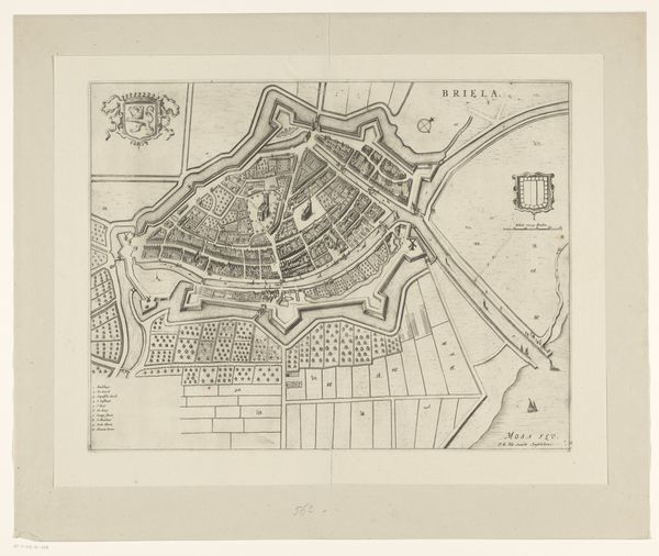 Curator: This delicately rendered etching presents us with "Plattegrond van Haarlem," a map of Haarlem created in 1808 by Daniël (I) Veelwaard, found at the Rijksmuseum. It is a cityscape presented with incredible detail, allowing one to examine Haarlem through the eyes of its past. Editor: There's something almost ghostly about it. The cool, neutral tones combined with such sharp lines – it’s as if the city has been frozen in a moment, pinned down under a microscope for scrutiny. You notice how everything fits into a kind of calculated structure? Curator: Absolutely. Notice the city's defensive walls transforming into the clean lines of an urban plan. Those shapes reveal how critical infrastructure influenced civic identity and collective self-defense strategies within the space, reflecting anxieties and ambitions around maintaining boundaries and stability during periods that saw much wider political shifts across Europe. Editor: The walls form a beautiful shape, almost flower-like, if flowers were forged of iron and strategy. The rivers and canals snake their way through it, adding contrast between natural form and geometric design, like an organized flow through the heart of what, otherwise, reads to me almost as chaos. Curator: But even the flowing lines can hold profound cultural significance, remember. Waterways like this served as trade routes, as well as defensive moats. Even the bridges themselves – consider them not just as functional connections but symbols bridging communities within. Each etched line carries a layer of human interaction, of negotiation. The cityscape, a story in visual form. Editor: True enough, but what about this visual narrative is specific? Even without prior historical information, the aesthetic composition—especially the play of angular edges—strongly evokes the feeling of eighteenth-century neoclassicism to me. There’s that Enlightenment drive to classify and arrange, applied directly to the world around them, made explicit on the page in a diagram. Curator: Indeed, what a treasure for unlocking narratives held within Dutch collective consciousness through these etched symbols of landscape. Editor: Quite so. Analyzing the physical layout with semiotic awareness, one understands how that influences meaning.