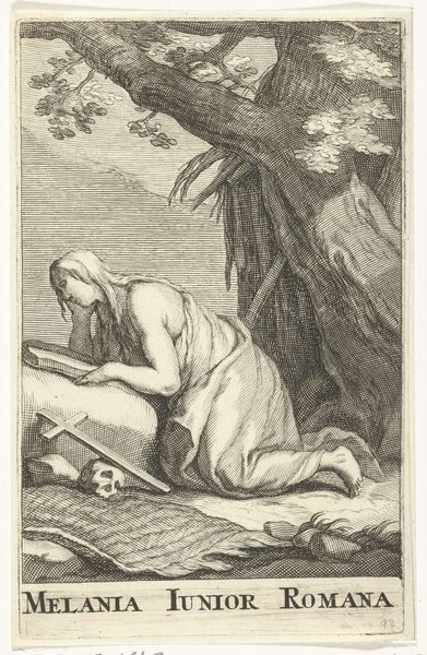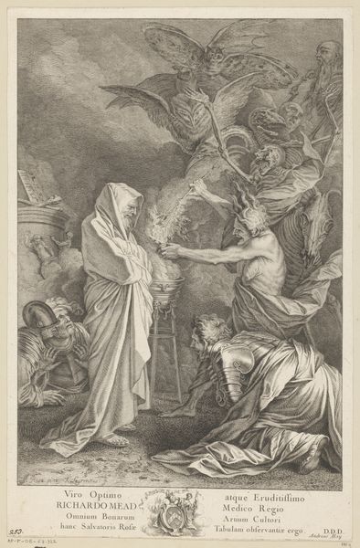 Curator: I’m immediately struck by the swirling composition; a macabre dance captured with such frantic energy. Editor: Indeed. What you're observing is "Death Dragging an Old Man to His Tomb," an engraving by Stefano della Bella, likely completed between 1643 and 1653. You can find this print residing here at the Metropolitan Museum of Art. The use of line, the chiaro-scuro – masterful. Curator: The hatching certainly creates a dynamic visual texture. See how the parallel lines and cross-hatching define form and volume, particularly on the figures of Death and the old man? It's quite evocative. Editor: The labor involved in producing such detail using engraving, repeatedly scoring the copper plate...consider the socio-economic realities shaping della Bella’s practice. These prints weren’t simply artistic expressions, but commodities within a market. Their wide distribution impacted their significance and legacy, offering a means for various populations to contemplate such loaded themes. Curator: Beyond the materiality, note the positioning of the hourglass—a classic memento mori symbol—a focal point that anchors the composition. It underscores the fleeting nature of time and the inevitability of death, framing a symbolic architecture that elevates it beyond simple social commentary. Editor: Yes, the hourglass speaks to mortality and process: of manufacture, dissemination, consumption. These allegorical elements reflect baroque society's intricate anxieties surrounding life's brevity and its vanities when juxtaposed against divine judgment. It forces one to reflect on labor relations, the ebbs and flows of demand... and the socio-political narratives intertwined. Curator: Della Bella certainly invites viewers into a contemplation that goes beyond simple observation. The power lies within how line and form converge, prompting reflection on the human condition itself. Editor: It reminds us of our own fleeting existence, the labor behind artistic creation and social constructions. An image, mass-produced and available for purchase to a wide variety of consumers who could see their stories depicted therein. Curator: Quite sobering but very effective nonetheless. Editor: Precisely, prompting introspection through the artist's craftsmanship.