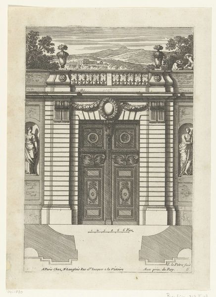 Jean Lepautre etched this title page, "Porte Cochere," sometime in the 17th century. A grand entrance is flanked by figures, perhaps philosophers or gods, standing guard like stoic gatekeepers. Above the door, we see a carved lion, a symbol of strength, courage, and nobility, deeply rooted in heraldic and royal traditions. The lion motif, however, stretches far beyond French architecture. We see it in ancient Egyptian art, guarding temples, and in Mesopotamian sculpture, symbolizing royal power. Consider the Lion Gate at Mycenae; these symbols echo through time, resonating in the collective memory. Each era adapts the symbol, loading it with new cultural significance while retaining echoes of its primal power. The lion's presence here suggests more than just architectural ornamentation; it speaks to the aspirations of those who dwell within. In the play of conscious and unconscious symbolism, the lion evokes an emotional response—a sense of awe and respect. These symbols never truly die; they transform and reappear, perpetually engaging us.