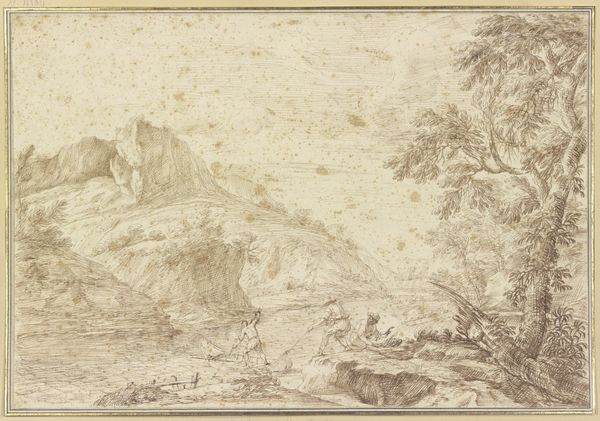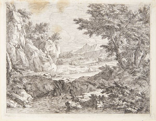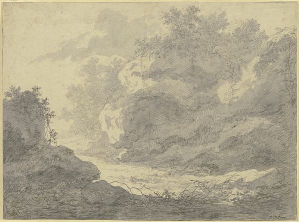 Curator: This drawing by Ferdinand Olivier, titled *Gebirgsgegend mit einem groβen Felsstück*, or *Mountainous Landscape with a Large Rock*, dates back to 1840. It's currently held at the Städel Museum. What's your initial take? Editor: Austere beauty. I'm immediately drawn to the rock itself; it anchors the whole composition. You can feel the weight of the graphite against the paper, you know? There’s something very raw about its making. Curator: Rawness is key, I think. Olivier was part of that Romantic movement, idealizing nature, sure, but also interested in a directness of experience. The graphite captures a starkness of the mountains—an unyielding quality of light, rock, and leaf. It’s very of-the-moment. Editor: Exactly! You said "idealizing", but it feels almost like early industrialization peeking through. All this graphite—where did it come from? Who mined it? I like to think of the social and material implications rippling outwards from the tip of the pencil. Curator: Ah, the shadow factories! I see your point, it’s fascinating to look at graphite and think about its production... yet the beauty here overwhelms me still. Olivier clearly saw the sublimity in landscape and also in *form*. Consider how the pencil moves—how light caresses each boulder. Editor: Yes, but it's WORK, isn’t it? All that shading, cross-hatching… the paper becomes a site of production. High art, certainly, but still… manual labor visualized! Even the artist’s consumption habits, right down to the very grain of the paper, are present. Curator: I agree completely. Each deliberate stroke carries with it both skill and a love of the craft. This pencil wasn't a printer, spewing off images with automated indifference—each one unique, intentional, and revealing of the natural landscape and the artist. Editor: So true. Looking at this piece I see more than just landscape; I also appreciate all the materials required in bringing it to life, the layers of history both human and geological folded into one humble graphite drawing. Curator: Thank you. You helped me focus in on the materiality, too. From that enormous boulder down to each stroke and fiber, the artwork presents to us both process and sublime outcome!