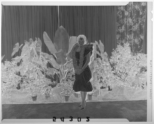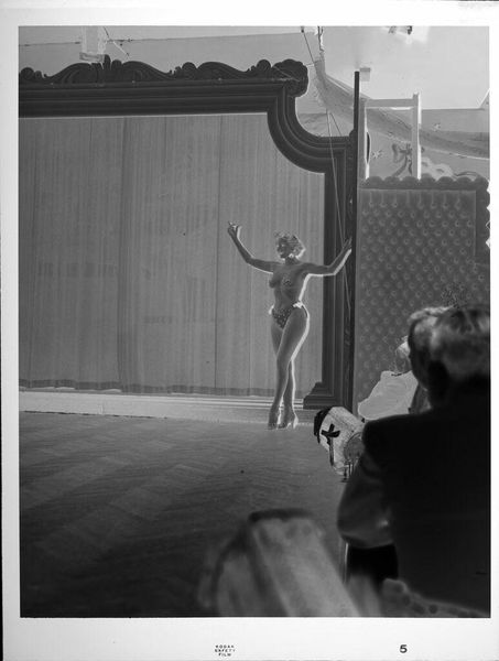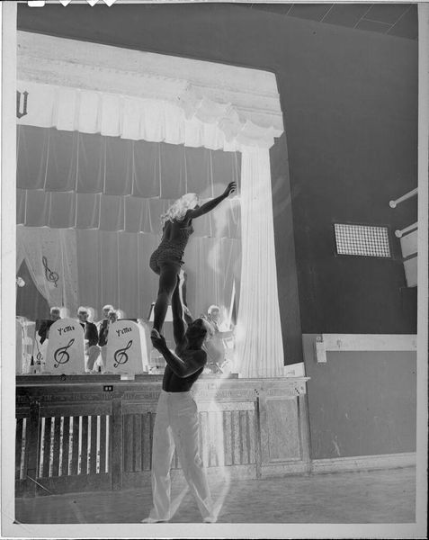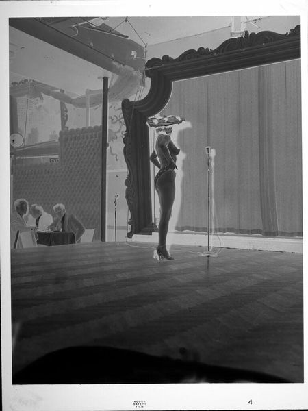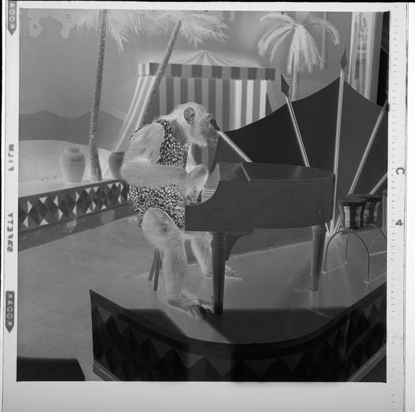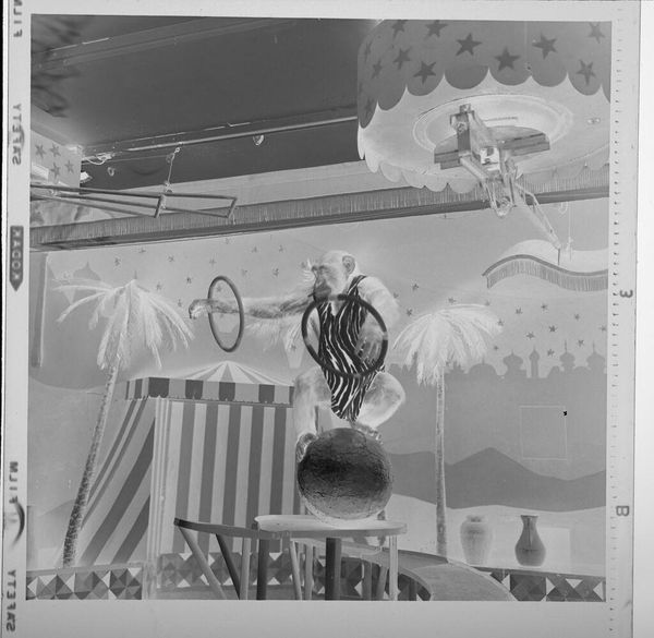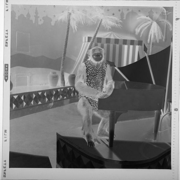 Editor: This small, untitled photograph by Jack Gould features a chimpanzee on a unicycle. It feels quite surreal and theatrical. What cultural echoes do you perceive in this image? Curator: The chimp, arms raised, triggers a complex response. In visual language, this represents subjugation but also forced spectacle. Does the setting, suggestive of an exotic locale, reinforce any colonial-era power dynamics for you? Editor: I see that now. The stage setup adds another layer to the chimp's subjugation by creating the illusion of a performance. Curator: Exactly. The image invites us to consider the cultural memory of animals used for entertainment and the ethics of such displays. Thank you for making a point to consider this too. Editor: It's been enlightening to discuss the symbolism embedded within such a seemingly simple photograph.