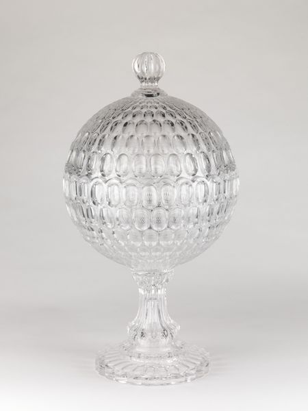Curator: This crystalline form, friends, is a covered compote, an exquisite piece of glass artistry dating back to around 1850, attributed to the Pittsburgh Glass Company. Editor: Isn’t it lovely? The immediate impression is that of refined sweetness, like an enchanted confectioner's dream, with a certain vintage aura. Curator: Vintage it certainly is! Let's delve into its composition. Notice the clarity and brilliance of the glass itself. The symmetrical design—repeating circular motifs over both the lid and bowl, and an expertly fashioned stem— speaks to an elevated level of craftsmanship of its era. Editor: I find it's playful as well, isn't it? Like a child's oversized crystal toy! Almost daring you to lift the lid and dive into some sweet forbidden delight... What do you think they stored in there back then? Preserves? Candies? Or maybe secrets and dreams? Curator: Perhaps all of the above! The pattern resembles something akin to a honeycomb; consider that alongside its form, and the possibilities of sugary delights stored within come to the fore. Editor: It's funny how everyday objects become symbols, you know? A simple vessel transforming into a container for yearnings and nostalgia... a time capsule shimmering with hope... even heartbreak. Curator: I’d say you’ve hit on the crux of it! Beyond the material, form, and date of production, the object becomes a locus for broader human stories. We gaze upon a relic from times past that offers insight to how it felt to exist then. Editor: Exactly, so as we peer into this glass bubble, let’s remember the bittersweet essence of memory. Curator: Well put! It reminds us that sometimes the most precious treasures aren’t the candies themselves, but the gleaming jar in which they’re kept.