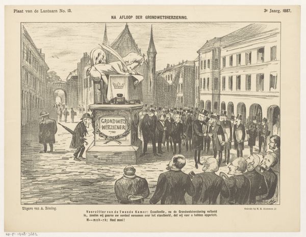 This is Johan Michaël Schmidt Crans' lithograph "Spotprent op de nieuwe volksvertegenwoordiging", made in 1866, which translates to "Cartoon on the new parliament". This piece emerged during a period of significant political transition in the Netherlands, following revisions to the constitution that aimed to modernize the government. This political cartoon is visually striking. We see the artist using satire to comment on societal and political structures. The figures are caricatured, perhaps reflecting skepticism or criticism towards the new parliament. In the foreground, soldiers are pointing their weapons towards the viewer, while men on horseback are in the middle ground. In the background, what appears to be a church or governmental building looms. The text at the bottom of the lithograph seems to reinforce a sense of restricted freedom. Crans' work invites us to reflect on the complexities of political change and the tensions between tradition and progress. It highlights the ongoing negotiations of power, representation, and the emotional experience of witnessing societal transformation.