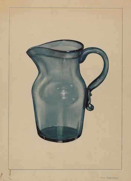 Editor: We’re looking at Janet Riza's "Pitcher," created around 1936, done in watercolor. It's a simple depiction, but I'm struck by how effectively she captures the translucence of the glass with just a few washes. What draws your attention when you look at this? Curator: The artist's handling of light and shadow interests me. Observe how the tonal variations define the pitcher's form, subtly indicating its volume. The near absence of strong chiaroscuro lends a sense of flatness, pushing the image towards a symbolic, rather than a purely representational, object. Do you see how this distillation reduces it to its most essential qualities? Editor: Yes, definitely. The simplicity emphasizes its form. It feels both modern and classic, somehow. So, how would a formalist critic approach a work like this, one seemingly so straightforward? Curator: Precisely by analyzing these formal relationships. The subtle shift from darker greens outlining the silhouette to lighter, almost faded hues on the body of the pitcher creates depth while also flattening the composition. The carefully rendered handle contrasts the smooth body; notice its textural difference. Editor: That makes sense. The darker handle does bring it forward visually. Is there anything else formally noteworthy here? Curator: Note also the restrained palette. The artist limits herself to shades of green, generating harmony and suggesting a particular coolness or tranquility. It invites a very focused gaze at color as structure, almost apart from subject. Editor: I'm beginning to see the importance of focusing on these intrinsic qualities, and how much they can tell us about the artist’s intent, regardless of historical context. Curator: Exactly. The real meaning, for a formalist, lies within the composition, technique, and visual balance the artist achieves. "Pitcher," after all, it's a highly revealing title, focusing the artwork in that still life, rather than making grander statements about its possible purpose.