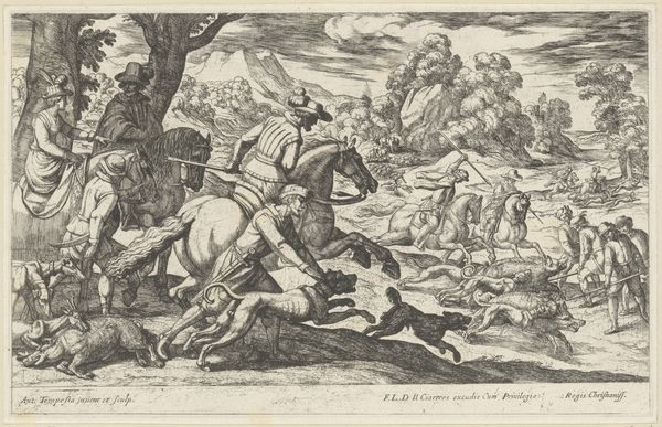 Editor: We're looking at "Jacht op everzwijn met valk," or "Hunting Boar with a Falcon," created around 1609 by Antonio Tempesta. It's an engraving housed in the Rijksmuseum. The first thing that strikes me is the sheer frenzy of the hunt, all captured in such detailed line work! What jumps out at you when you look at this piece? Curator: Well, the controlled chaos is certainly captivating. But I see something more… the ritual of it all. The hunt isn't just about survival; it's a performance, a display of power and status. It makes me wonder, what narratives do these scenes spark in *your* imagination? Do you see it as glorifying a specific moment in time, or commenting on broader themes of human dominance over nature? Editor: I think it's a bit of both, actually. You’ve got the immediate action, the thrill of the chase, but also a sense of detachment, almost like these hunters are actors in a play. That staging creates a strange distance, wouldn’t you say? Curator: Distance, yes! It reminds me of those dreams where you’re running but never seem to get anywhere. The perspective pulls you in while the sheer busyness keeps you out. Plus, think of the falcon – a symbol of nobility literally perched on the hand of power. What could be more theatrical than that? It makes you ponder who the true actor is, and who is simply reacting. Editor: That's a great point! The falcon being almost an emblem of the entire spectacle makes you wonder how much the falcon has to do with the people actually doing the boar hunt. Curator: Exactly. Editor: I hadn't considered the hunt as a piece of theatre before. It gives me so much more to think about when considering context. Curator: Indeed! A bit of drama mixed with raw reality makes for a potent potion of thought!