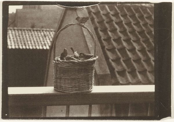 Editor: We're looking at Richard Tepe's photograph, "Sparrows at a Dish of Food," taken sometime between 1900 and 1930. It has this beautiful, almost dreamlike sepia tone. It makes me feel nostalgic. The birds huddled around the food look very vulnerable. What strikes you most about this image? Curator: I see a gathering, a commonplace scene elevated through the camera's gaze. These birds, captured in a moment of shared sustenance, echo older traditions of symbolic representation. Bird imagery carries cultural weight - freedom, vulnerability, the soul's journey. Notice the stark shadows contrasting with the soft focus. Do they remind you of a symbolic struggle or tension, perhaps between instinct and circumstance, vulnerability and resourcefulness? Editor: I hadn’t thought of it that way, but I see what you mean. The sharp shadows do create a feeling of being caught, almost trapped. Curator: The photographer likely selected the elevated viewpoint for a reason. It provides the audience with an overview of the natural world of birds. How does seeing the world from above affect your interpretation of it? Editor: It's interesting how the ordinariness of birds feeding transforms into something more profound, maybe about community and shared experiences. Curator: Precisely. Even in this unassuming image, Tepe manages to tap into something timeless. Consider how such photographs build cultural memories, connecting us to the lives—both human and animal—of those who came before. The very act of photographing something so ordinary implies a wish to memorialize and interpret, wouldn't you agree? Editor: Yes, absolutely. I initially saw a simple scene, but now I see a story filled with symbolism and connections to a shared past. Curator: Indeed. These sparrows, through Tepe’s lens, become vessels carrying centuries of human meaning.