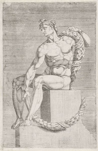 Jacob Matham created this engraving, "H. Sebastiaan," in the late 16th or early 17th century. During this time, the Dutch Republic was emerging, marked by religious conflicts and a burgeoning interest in classical art. Matham’s depiction of Saint Sebastian, pierced by arrows and tied to a tree, draws from both religious iconography and classical ideals of male beauty. We see a vulnerable yet idealized figure, embodying a narrative of suffering and redemption that resonated deeply in a society grappling with its own struggles for freedom. The sensuality of the piece, however, should not be overlooked as Matham paints the saint with great beauty. The original audience, in the midst of significant cultural and religious shifts, would have seen in Sebastian a figure of both religious devotion and humanistic beauty. Consider how Matham merges the sacred and the sensual, reflecting the complex interplay of religious fervor and humanistic ideals during the Dutch Golden Age.