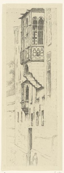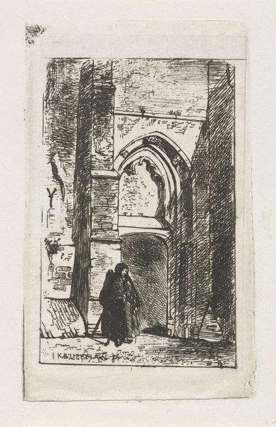 Editor: This is "Kingsgate, Winchester," an etching made in 1902 by David Young Cameron. It's quite small, yet there’s a wonderful sense of depth, almost like looking through a keyhole into another world. What are your thoughts on the overall structure and composition? Curator: Observe how the oval format focuses our gaze. Cameron masterfully employs contrasting light and shadow to define the architectural forms. Note the rhythmic repetition of arches leading the eye deeper into the scene. Semiotically, these architectural features serve as markers of history and order. Editor: It's interesting how the figures inside the archway are suggested more than depicted. They seem almost spectral. Curator: Indeed. The artist prioritizes the interplay of light and shadow, texture and line to capture the essence of the location. Are the figures carriers of symbolic value? The ambiguity allows for multiple readings, inviting the viewer to participate in constructing meaning, considering elements of shape, contrast, and their placement within the visual space. How does the linearity help orient the viewer? Editor: The linear details give definition to the stone and wooden construction, which might otherwise look a little undifferentiated due to the limited tonal range of the print. Curator: Precisely. Now, let's consider how the print's limited scale contributes to its intimacy and preciousness, reinforcing its status as a carefully crafted object. What, then, is the piece’s place within art history, in terms of materials and movement? Editor: Understanding the structural decisions enhances my appreciation of the piece, showing how the form shapes the narrative, or perhaps even becomes the narrative. Curator: Agreed. A focus on form allows a deeper engagement. It helps uncover how visual elements come together to make an artistic piece meaningful, rather than using context to inform your opinion.