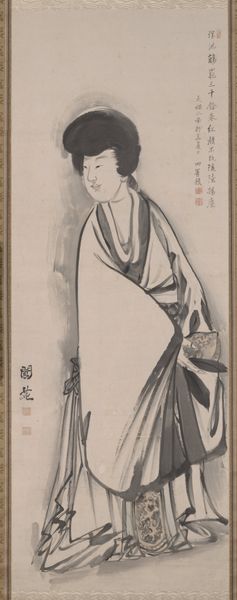 Editor: Here we have an untitled gelatin-silver print from the 19th or early 20th century, of Japanese origin. There's a formal quality to it that I find striking, but it’s hard to put my finger on exactly what’s going on. What do you see in this piece? Curator: This photograph operates as a potent visual symbol, carrying a wealth of cultural memory. The kimono, the fan, even the woman's hairstyle are laden with meaning, signifiers of status, beauty ideals, and social roles within a specific historical context. Consider how these visual elements speak to broader ideas about Japanese identity during a period of increasing interaction with the West. What impression do you get from the photographic style? Editor: It feels almost…staged. Like a deliberate attempt to present a particular image. Curator: Precisely! It’s vital to think about who might have commissioned this photograph and why. Was it intended for a Western audience eager for exoticized glimpses of Japanese culture? Or was it intended for local consumption, reinforcing traditional values? How do those different possibilities shift the photograph's meaning? Editor: So, it's less about the individual and more about the symbolic representation of a culture at a certain moment? Curator: In a way, yes. But it's also about the complex interplay between individual agency and cultural expectations. The woman isn't merely a passive object; she’s actively embodying and performing a role through visual language of her clothing and stance. Consider what it meant to be a woman at this intersection of tradition and modernity. How do you think she sees herself? Editor: It's much more layered than I initially thought. I'll definitely be thinking about the intended audience and the symbolic language at play in the photo moving forward. Curator: Indeed. It's a fascinating lens into a time of significant cultural exchange and transformation, told through potent visual symbols.