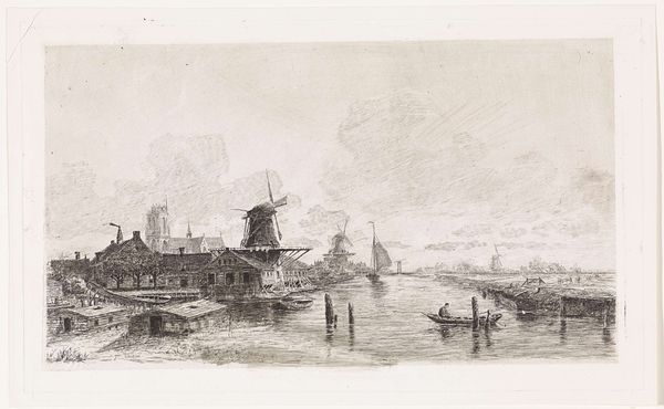 Editor: So, here we have Elias Stark’s "River Landscape with Village and Wood Sawmill," an etching from 1888. It’s got such a detailed yet ethereal quality. The windmills and reflections in the water are quite striking. How do you interpret this work, focusing on its formal aspects? Curator: The success of this composition relies on Stark's masterful control of line and texture. Note the careful layering of hatched lines creating a convincing sky, but also leading the eye diagonally to the mills and beyond. Editor: Yes, the hatching is quite distinct! What do you make of the contrast between the detail in the foreground structures versus the haziness in the distance? Curator: Precisely! Observe how the sharpness of detail contributes to spatial depth. The strong contrast in the foreground directs the viewer's gaze, initiating a visual journey. Stark invites our eye into the landscape and guides our perceptual exploration through his rendering of space. What function do you think the reflections on the water have? Editor: I suppose that it mirrors what's there in real life and blurs reality slightly, to enhance that dreamy feeling? Also, the vertical lines created add to that sense of perspective... Curator: Precisely, the reflections add to a sense of depth and complexity of form. Do you observe the interplay of light and shadow and their role in structuring the composition? Editor: Now that you mention it, it really adds drama and almost makes it feel alive! It seems so simple, but it really shows how a range of tones can impact a piece of art. Curator: Indeed. Paying attention to those formal properties encourages us to reconsider the nature of art itself. Editor: I completely agree, seeing this only from a compositional perspective changes everything about how I see landscape art.