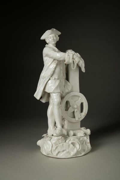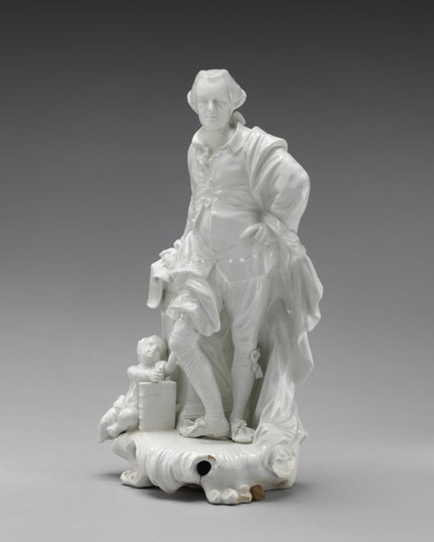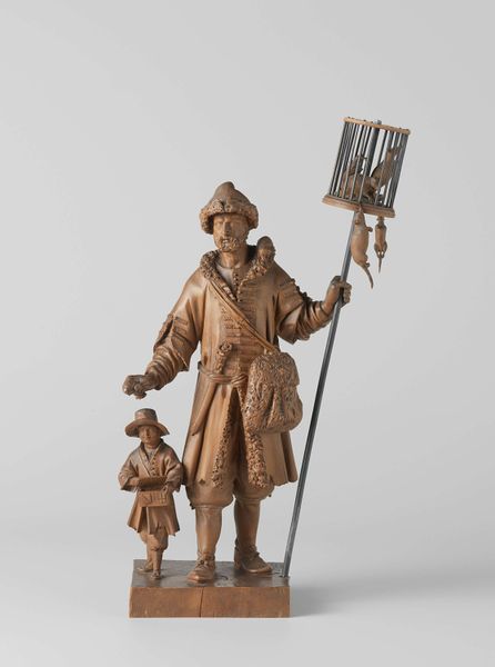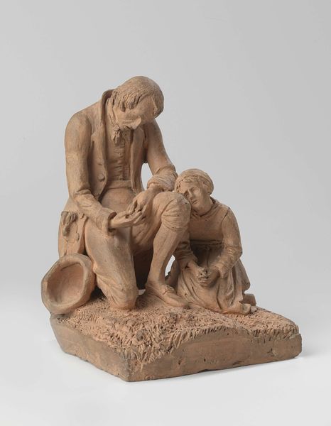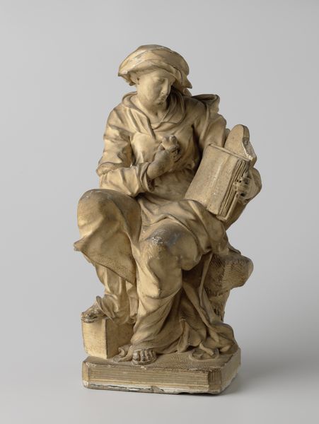 Curator: Here we have a wooden sculpture dating from the 1840s by J.A. Jerichau, titled “The German painter William Bottomley with his dog”. Editor: It's quite charming, though almost monochromatic. The dog, particularly, lends an air of gentle companionship to the figure, who seems deeply engrossed in a book. Curator: The texture of the wood certainly contributes to the overall feeling. Notice how Jerichau has meticulously rendered the folds of the man’s clothing, the fur of the dog, and the distinct planes of his face. It’s a careful balance of detail and overall form. Editor: I find it interesting that the sculpture focuses on William Bottomley. A study of artists and their relationship to society and class at that time may lend valuable insight into how artistic endeavors were regarded, and the networks in which they operated. Also the intimacy of this scene normalizes the painter with his cute dog. Was the painter more widely recognized back then or now? I'm eager to investigate further the racial undertones of his status as a "German painter". Curator: I would say that's going outside the intended representation here; to start layering a study about "racial undertones" onto this subject veers dramatically away from what’s structurally available in the image itself. Rather, what draws the eye is the pyramidal composition, the base widening towards the seated figure, with the dog almost perfectly mimicking the angle of his leg. It establishes an incredible stability. Editor: I still believe we cannot isolate this piece from the broader societal discourses. Artists and their companions are inevitably shaped by the social currents they inhabit. A close study will always serve any analysis of an artwork such as this. Curator: Perhaps, but appreciating its technical mastery and carefully constructed equilibrium doesn't require it to also be read as an example of social hierarchy! Editor: Indeed. Still, for me, the power of this lies in the potential to illuminate lives of creatives within the scope of larger conversations surrounding the human-animal connection as well as identity and representation in the mid-19th century. Curator: And for me, it's about how Jerichau achieved such incredible three-dimensionality with so few colors. Editor: A valid point! I suppose it's this multifaceted aspect of the artwork that is the beauty.
