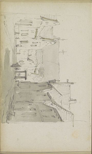 Editor: Here we have Joseph Marie Vien's "A Balcony in the Roman Forum," a drawing made sometime between 1744 and 1750, using graphite, pencil, and pen. What strikes me most is the raw, almost unfinished quality of the sketch. It captures a grand architectural vista with very basic materials. What’s your take on this piece? Curator: I see a record of artistic labor embedded in a specific historical moment. Vien’s choice of relatively humble materials - graphite, pencil, and pen - is telling. In contrast to the grand subject matter. It suggests a practical, almost journalistic, impulse to document the site, more aligned with craft than high art. Consider the means of production, too – sketches like this would have been instrumental in shaping the grand Neoclassical paintings being produced at the time, acting as blueprints of a kind. Editor: Blueprints? That's interesting, considering the drawing almost feels immediate and spontaneous. Curator: Precisely. The apparent spontaneity belies the work it performs within a larger system. These sketches democratize art by revealing its process and production. Instead of marble, bronze, or fine paint, we see the labor of the artist mediated through graphite and paper - accessible and relatively inexpensive materials. The labor becomes quite apparent, visible marks are left behind. Editor: I never thought about the social implications of the materials themselves. It makes me appreciate the artwork, and art making, on a completely different level. Curator: The materiality isn't neutral; it speaks to the artist's access and choices, revealing art as a product of its social and economic context, rather than divine inspiration. These 'lower' material are the bones upon which many pieces of classical art rested. Editor: Thanks for shining light on the process, materials, and their significance here. I definitely see it differently now.