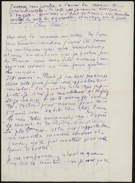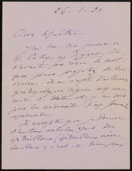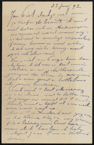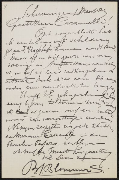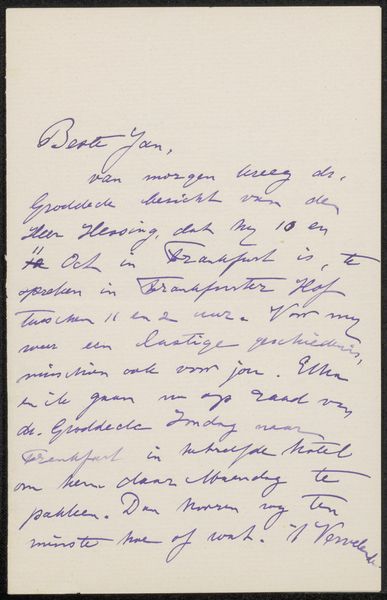 Curator: Editor: So, this is "Brief aan Jan Veth" (Letter to Jan Veth), potentially from 1904, created by Johannes Martinus Messchaert using pen and ink on paper. It strikes me as very intimate and personal. It’s just handwriting on a page. What jumps out at you when you look at it? Curator: What jumps out? Well, imagine receiving this. A burst of thought, feelings penned down probably in one sitting, with little regard for neatness, or perfection. Think of it less as something "made" and more like a little piece of someone’s soul landing right in your lap. Does that make sense? Editor: Absolutely! It feels like catching a glimpse of a private conversation. How do you think the act of writing itself influenced the artwork? Curator: I think the physicality is important. The immediacy of pen on paper... You can feel the speed of thought as you trace the lines with your eyes, can't you? Messchaert isn't creating an illusion, like a painting tries to do. He’s baring a piece of himself. It's incredibly modern, isn't it? In its complete lack of pretension. What do you think Messchaert is aiming to convey? Editor: That's a great question... Perhaps a sense of urgency or genuine connection? I mean the messiness adds to its sincerity. Curator: Perhaps. It's also interesting to consider who Jan Veth was and their relationship, and the cultural context of the time. Maybe with a bit of research we might uncover something that would radically change our perception. Editor: This has really changed the way I see artworks, as pieces of life and connection, not just static objects. Curator: Me too. There's so much to learn, and discover by approaching artworks with curiosity.