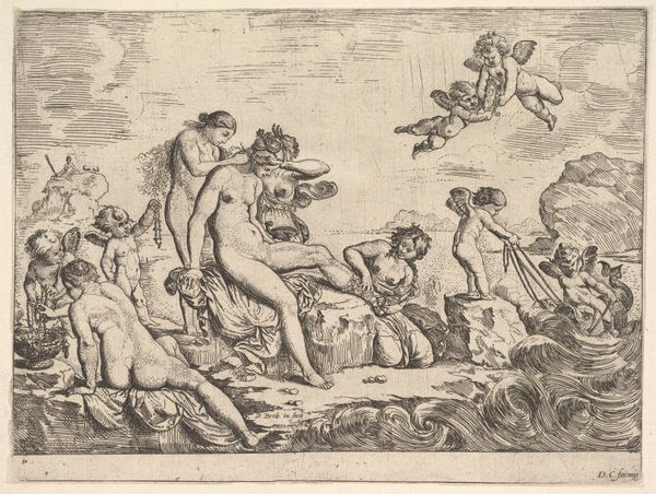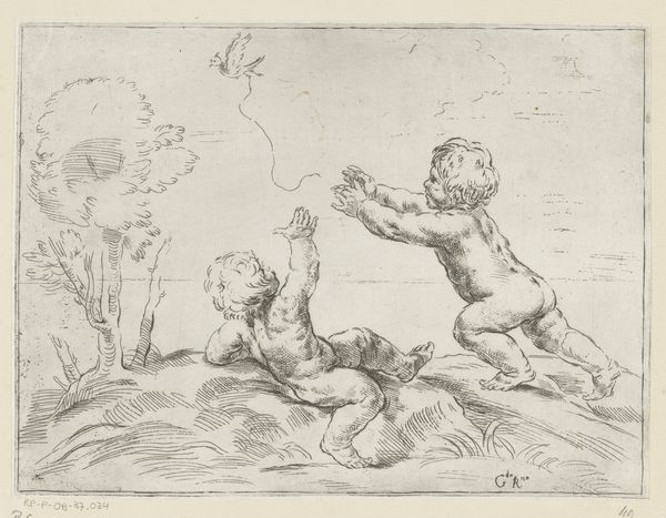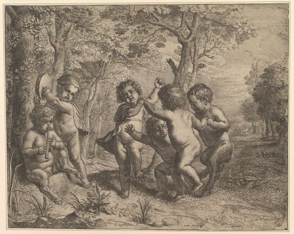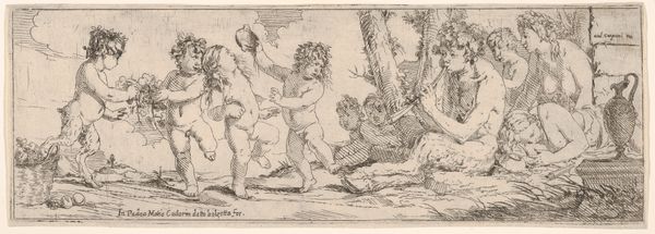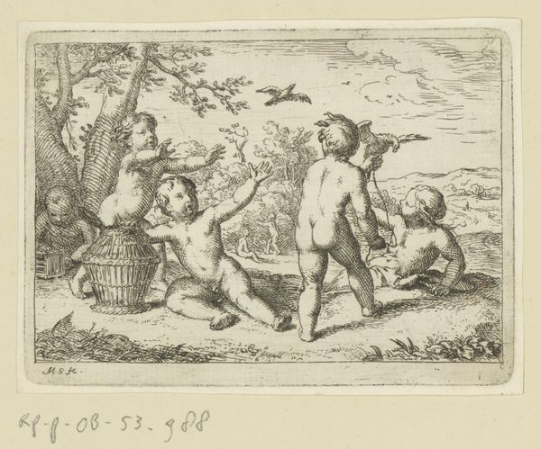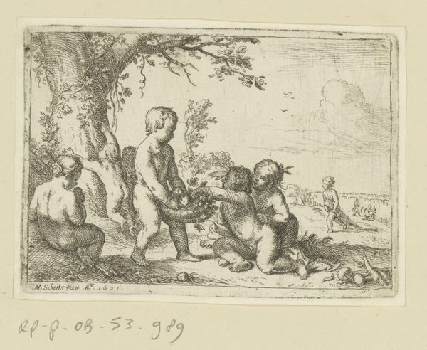 Matthias Scheits made this small print, "Autumn: Four Naked Children with Captured Fish," using etching, a process that democratized image-making. To create this print, Scheits would have coated a metal plate with wax, drawn through it to expose the metal, then bathed the plate in acid, which bites into the exposed lines. The plate is then inked and printed, transferring the image to paper. The fineness of the lines reveals the artist's skilled hand and control over the etching process. Prints like these facilitated the spread of knowledge, art, and ideas to a wider audience, moving art production away from unique, handmade artworks, towards something reproducible and more akin to industrial manufacturing. By focusing on the technical and material dimensions of printmaking, we appreciate how this artwork is tied to broader social and economic changes, challenging the traditional separation of art and craft.