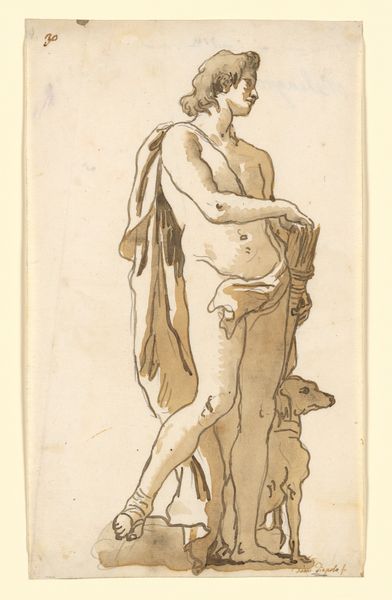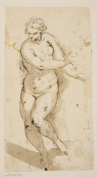 Curator: This is a drawing attributed to Giovanni Domenico Tiepolo, titled "Venus (?)". It likely dates somewhere between 1736 and 1804. What's your immediate take on it? Editor: There’s a starkness, almost an unvarnished quality to it. The gray washes feel like a subdued counterpoint to the typically flamboyant depictions of Venus. The medium itself, a humble drawing, feels deliberate. Curator: Deliberate how? Could it be highlighting class distinctions by depicting classical subjects with accessible, utilitarian materials? Tiepolo might be drawing a line connecting traditional narratives and challenging academic conventions of high art. Editor: It absolutely could. But beyond class, I’m thinking about how the female body has been commodified through these narratives. Is this Venus reclaiming agency, presented without the gilded frame and the rich pigments? Look at the casual gesture of the drapery – less an act of modesty, perhaps, than a dismissal of the male gaze. The materiality speaks volumes, especially given its time. Curator: That’s insightful. Thinking about the material constraints, did Tiepolo maybe also intend to hint at impermanence through the nature of the drawing? The quick sketches, light washes, lack the authority conveyed by marble sculpture, or the expensive canvas in oil painting, and this hints towards democratization of imagery? Editor: Possibly, though let’s also consider the implications around "impermanence" and womanhood, historically cast as fleeting and subordinate. Can we instead flip the script to suggest resistance, through subverting grand traditions that have long upheld patriarchal structures? The ink medium, normally reserved for sketching or studies, allows for a sense of immediate expression, something authentic... less about longevity and more about urgency of that moment. Curator: Good point. How does this piece resonate with our contemporary moment? Do you see it in conversation with more current debates about, say, representation, body image and accessibility within artistic practice? Editor: In our current sociopolitical climate, where issues of access, authenticity, and representation have never been so debated, Venus (?) speaks of self-authorship. Tiepolo subtly questions established frameworks, urging us to evaluate whose narratives gain prominence and, critically, the stories of bodies rendered visible or forcibly silenced by the systems of power at work around us. It’s a timely challenge to norms, that persists throughout the years. Curator: Agreed. It reminds us that, what materials and process involved will significantly shape a piece of work but social context of time can provide more profound commentary that is still able to reverberate within cultural understanding even today.