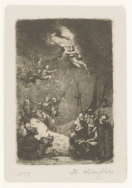Editor: Here we have Allart van Everdingen's etching, "The Bear is Attacked by the Peasants from Hendrick van Alcmar's Renard The Fox," dating from 1650 to 1675. It's quite a dramatic scene. I am intrigued by the composition and wonder what story is being depicted here? Curator: Indeed. It's more than just a simple hunting scene. The image comes from a specific satirical tradition—the medieval tale of Reynard the Fox, a series of fables popular throughout Europe that uses animals to lampoon human society and courtly behavior. Consider how the artist portrays the peasants – armed not with proper hunting weapons, but farm implements. What does that suggest about the social hierarchy being depicted, and perhaps criticized? Editor: So, it is about social commentary disguised as an animal fable! It appears quite chaotic, everyone is participating. Was that a common sentiment at the time? Curator: Precisely. Remember, this was a period of significant social upheaval in Europe. The rise of a merchant class and challenges to traditional aristocratic power were common. The etching gives visibility to an animalistic view of the lower classes. How does that change your interpretation? Editor: I did not perceive it as commentary about lower classes behaving like animals; I initially missed those layers of cultural messaging! Looking closer, there seems to be more class bias. It gives the artwork an uncomfortable vibe knowing there is underlying satire at play, portraying it in an exaggerated fashion. Thank you! Curator: You’ve touched upon something crucial—art doesn’t exist in a vacuum, and historical context is everything in how we decode artwork and visual messages. This small etching serves as a reminder of that, reflecting its era's social and political tensions.