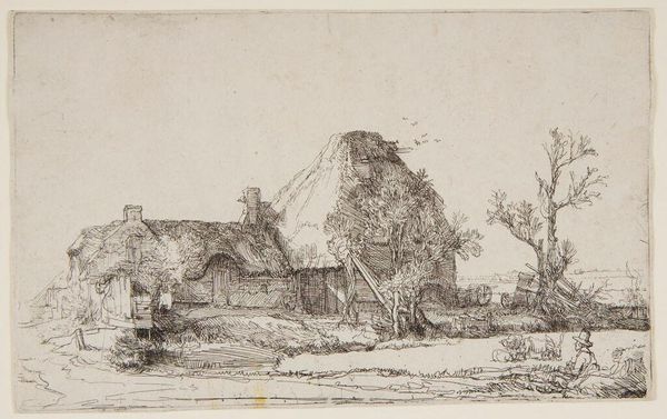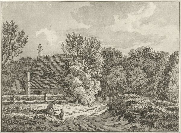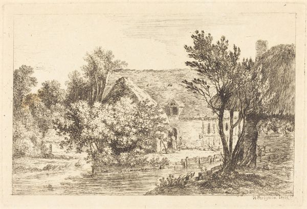 Curator: This intimate etching, created by an artist from the British School, presents a waterside house nestled amidst trees. It's small, only about 10 by 16 centimeters. Editor: I'm immediately struck by the sense of enclosure. The house, while central, seems almost consumed by the surrounding foliage. There's a feeling of being hidden away from the world. Curator: Indeed. The positioning of the house by the water suggests a connection to cycles of life and the constant flow of time, potentially symbolizing growth, renewal, and the unconscious. What about the artist's choice of etching? Editor: The detailed linework and layering of textures, achieved through etching, create a sense of depth and mystery, evoking a world of folklore. The limited color palette also adds to this rather antique feeling. Curator: The house itself, with its visible chimney and gable, can be seen as a symbol of domesticity and rootedness, perhaps a commentary on British national identity during a period of industrial and social change. Editor: I can see that. The image whispers of simpler times but also reminds us that such idealized visions are often constructed narratives, obscuring complex power relations that shape rural life and labor. Curator: This piece offers a quiet moment of reflection, highlighting the interplay between the personal and the collective, the individual and their environment. Editor: Absolutely. This small window onto another world prompts us to explore the layers of meaning embedded in the visual symbols of home and landscape.