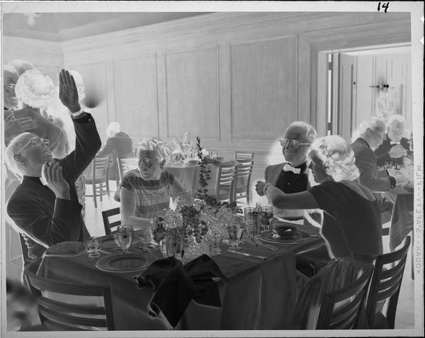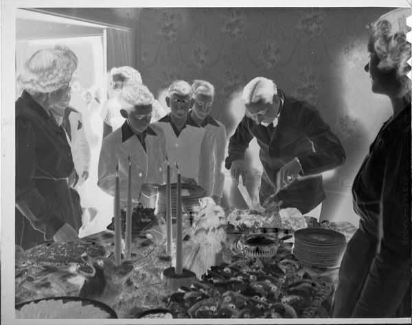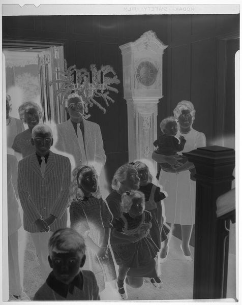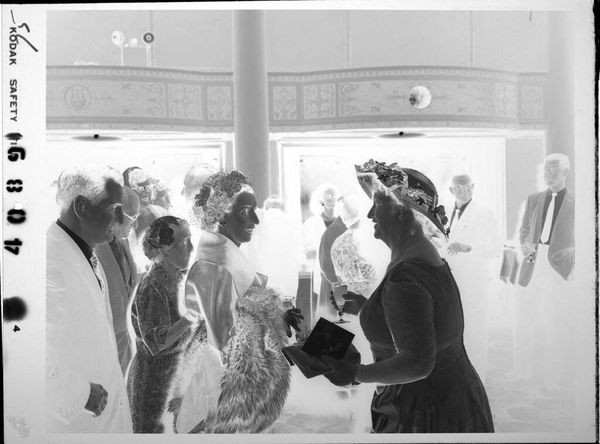 Editor: This is an untitled photograph, "ladies and gentlemen standing and drinking", by Lucian and Mary Brown. It's a black and white negative, so it's like seeing a ghostly reflection. I'm struck by how it captures a moment of apparent social gathering. What do you see in it? Curator: I see a staged presentation of social hierarchy. The composition and the subjects' attire suggest a performance of class and respectability. What narratives are these individuals enacting, and who benefits from these performances? Editor: A performance, that's interesting. The way they present themselves in a social setting? Curator: Exactly. Consider the historical context. Whose stories are deemed worthy of documentation, and how does that shape our understanding of the past? The photograph becomes a contested site where power and representation intersect. Editor: That definitely makes me look at it in a new light. Thanks! Curator: My pleasure. These images are not just neutral records; they are active participants in the construction of social meaning.